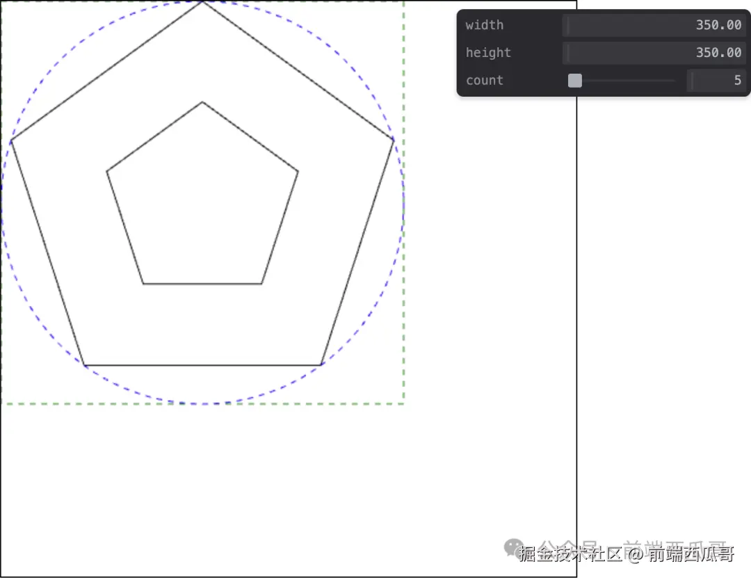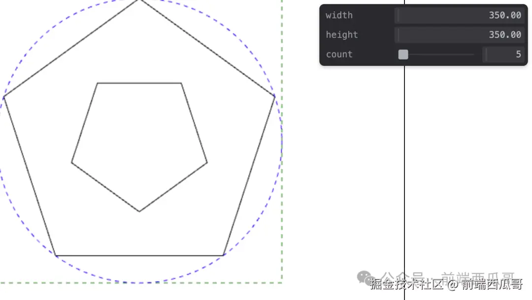 从最顶部的点开始,不断地旋转 360 / count 的角度,得到 count 个点。中心点是坐标原点。