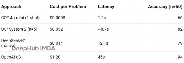实战数据也印证了这一点。2025 年 1 月发布的 DeepSeek-R1,其纯强化学习版本在 AIME 数学基准测试中,仅通过学习自我验证(Self-Verify),得分就从 15.6% 暴涨至 71.0%;引入 Majority Voting(多数投票)机制后,更是飙升至 86.7%。到了 4 月,OpenAI o3 在 AIME 上更是达到了惊人的 96.7%,在 Frontier Math 上拿到 25.2%,但代价是处理每个复杂任务的成本超过 $1.00。