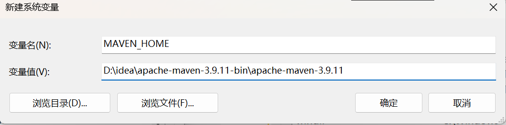 4.配置 MAVEN_HOME ,变量值就是你的 maven 安装的路径(bin 目录之前一级目录)
