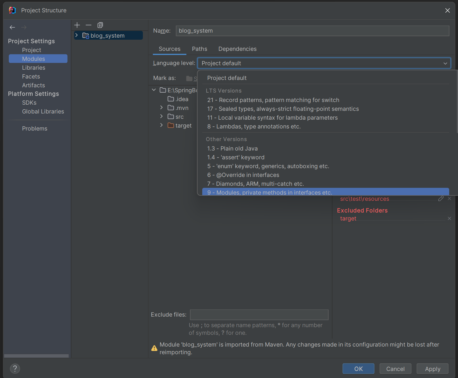 点击 File,选择Project Structure,打开 Project settings ,配置 Project SDK和Project language level