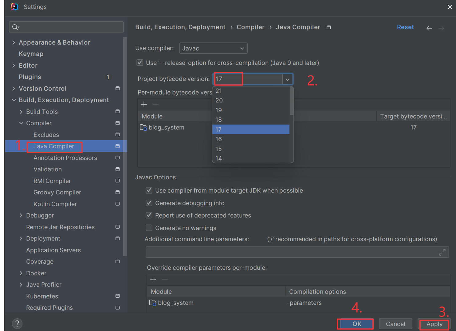点击settings,跟着下面图片操作,选中项目需要的jdk17