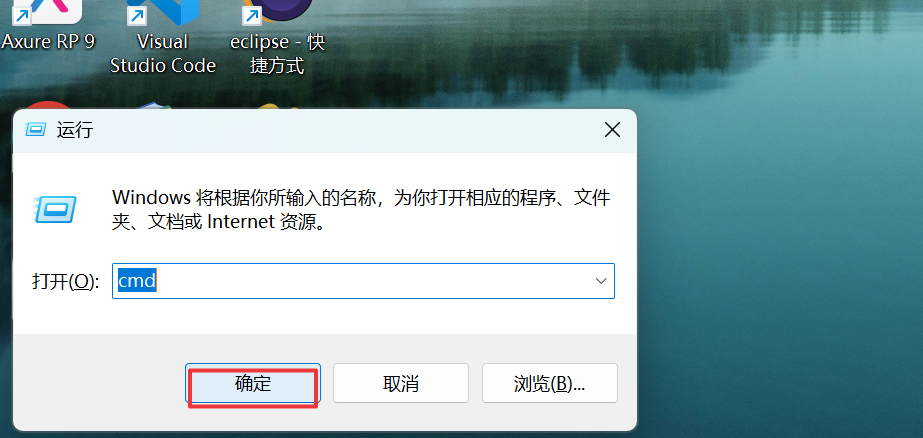 6.验证安装: Win+R打开命令行,输入cmd,点击确定。