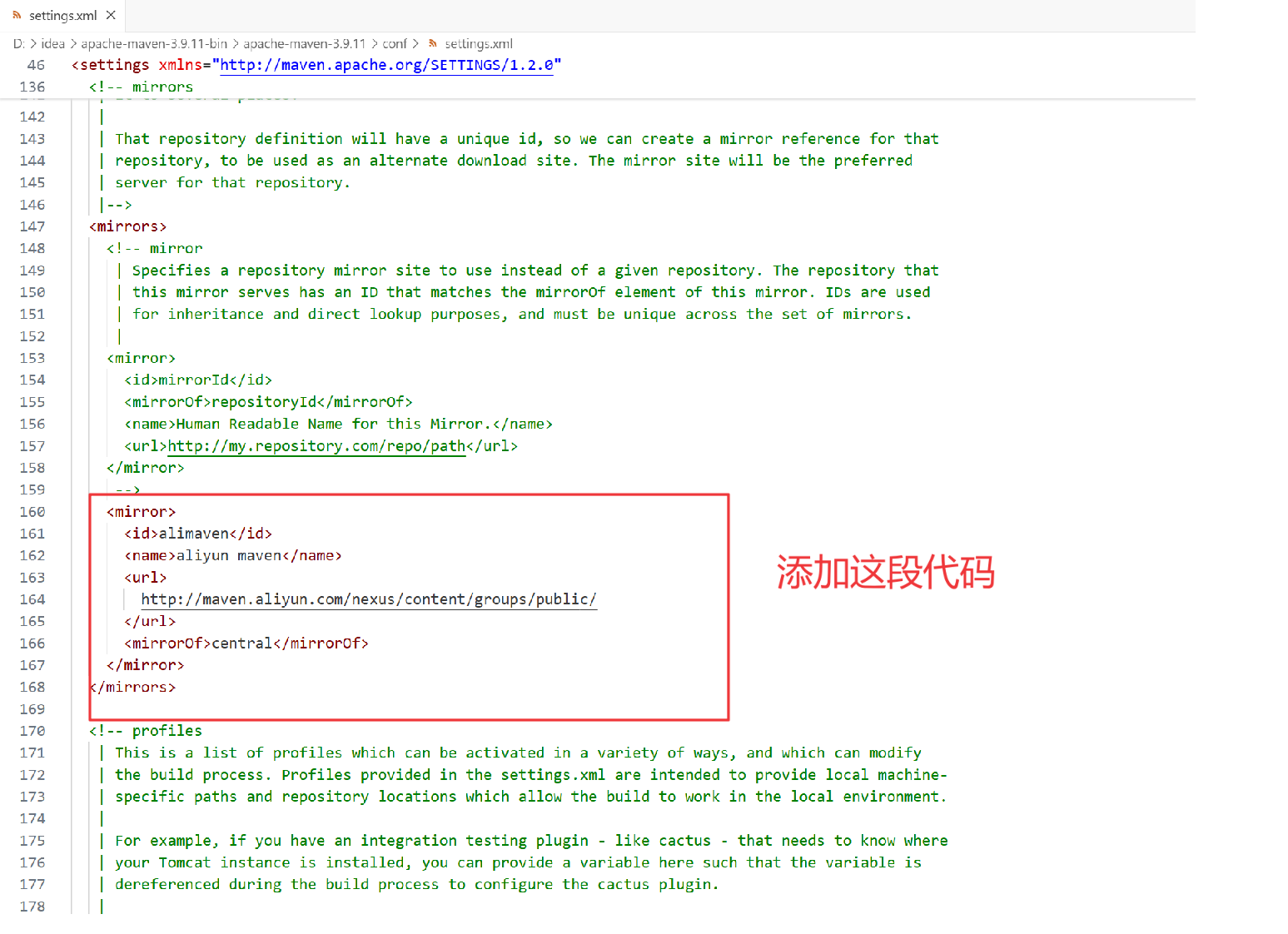 在 <settings> 标签内,找到 <mirrors> 元素。如果该元素不存在,则手动添加它。