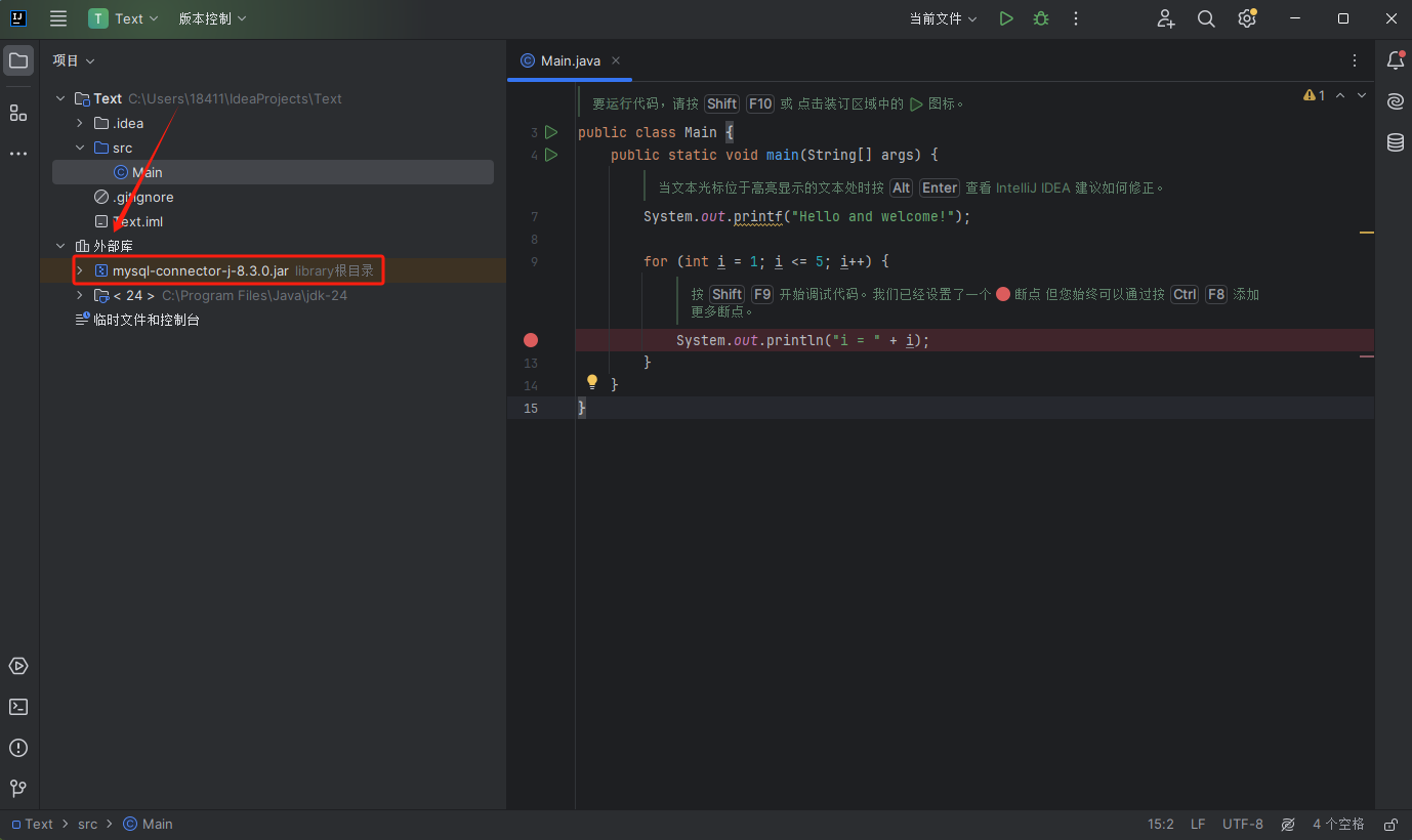 项目配置: 在 IntelliJ IDEA 项目中正确添加 MySQL JDBC 驱动库,为 Java 程序连接数据库奠定基础。