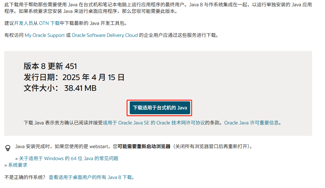 JAVA下载需到官网下载 Java中点击"下载适用于台式机的 Java"。