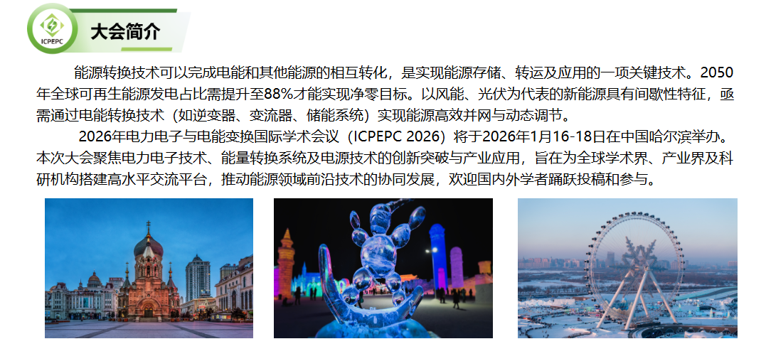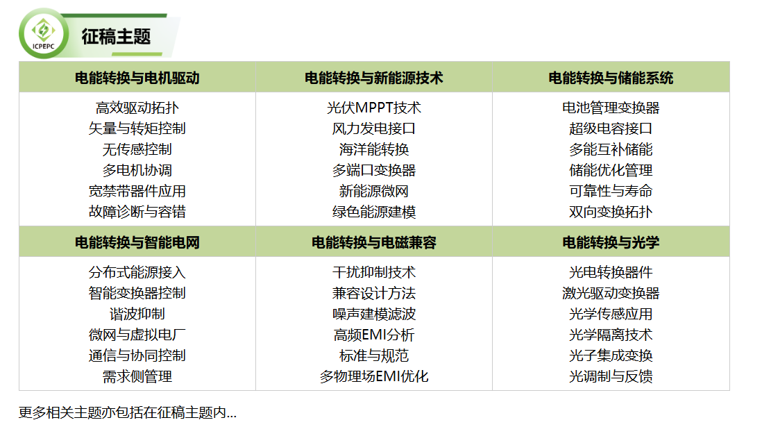 电力电子与电能变换是现代电力系统智能化、高效化运行的核心支撑,也是 ICPEPC 2026 聚焦的核心议题。该领域融合了电力电子器件、拓扑电路设计、智能控制算法、电能质量治理等关键技术,覆盖新能源并网、电动汽车充电、工业电能变换、微电网调控等核心场景。以下从技术维度拆解核心构成与应用场景: