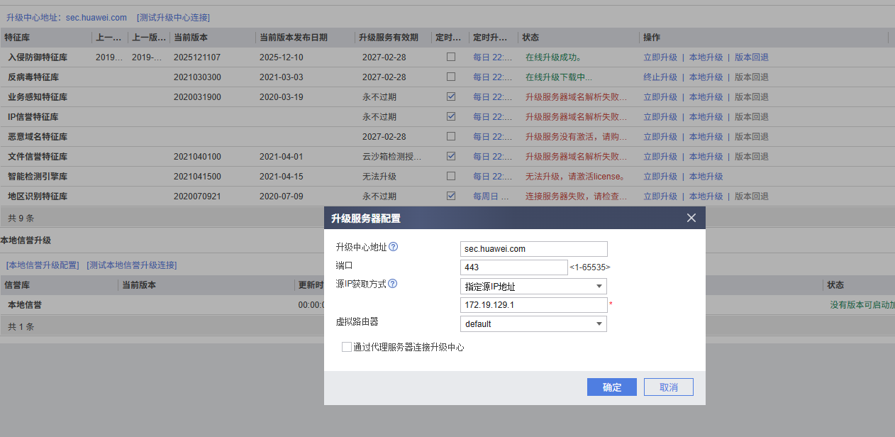 4)在升级服务配置中设置"指定源IP地址",虚拟路由器设置为该IP地址对应的虚拟系统(例:default)