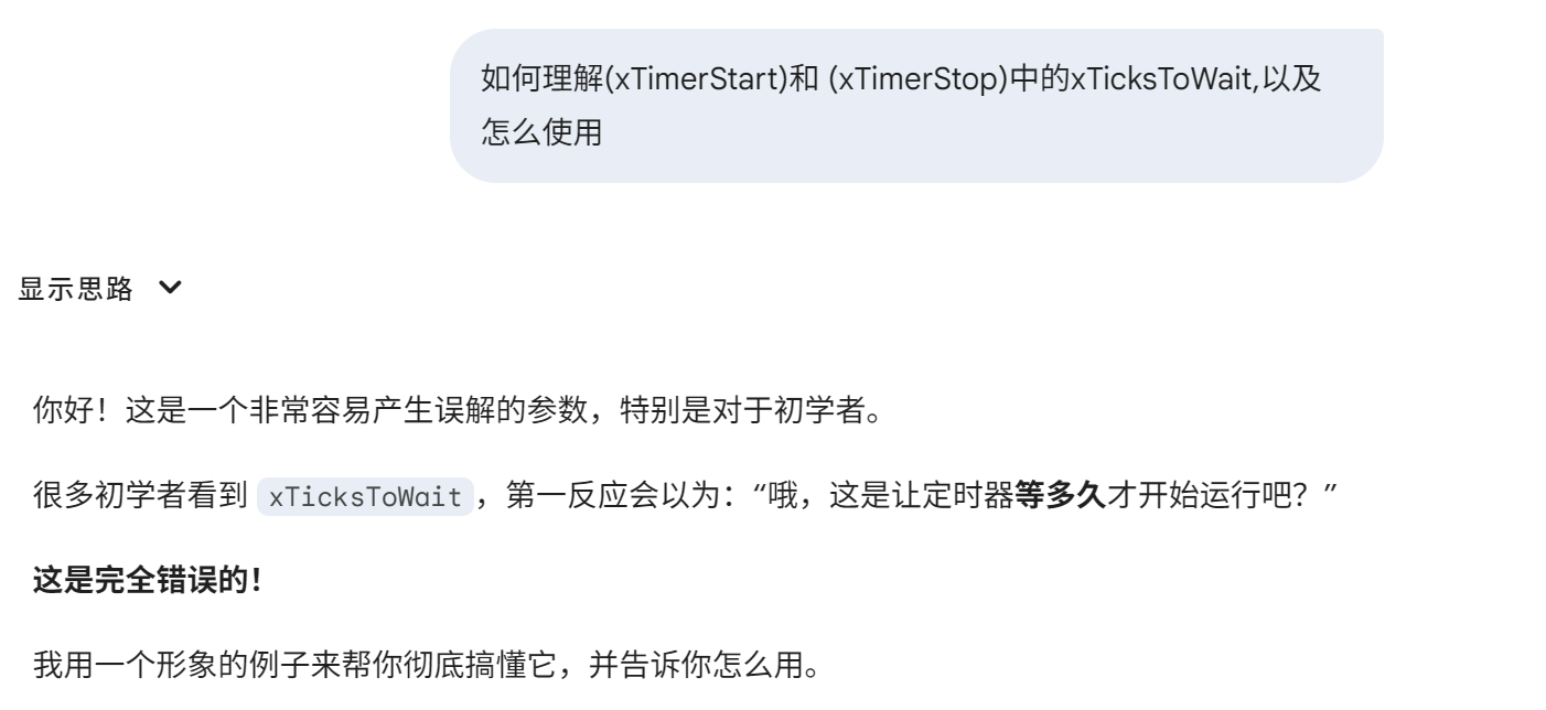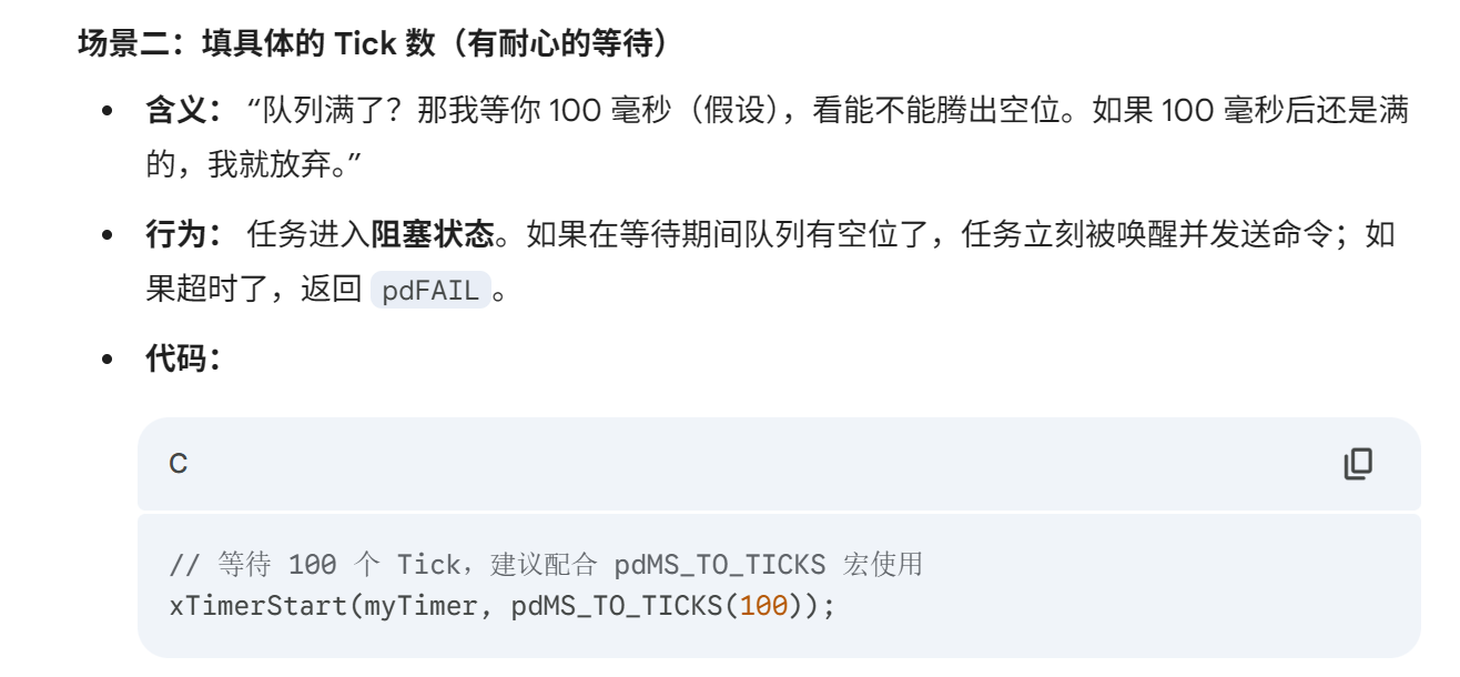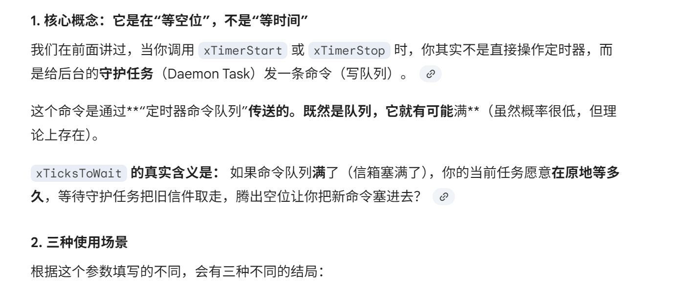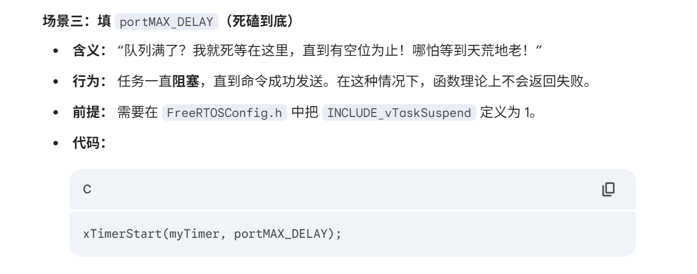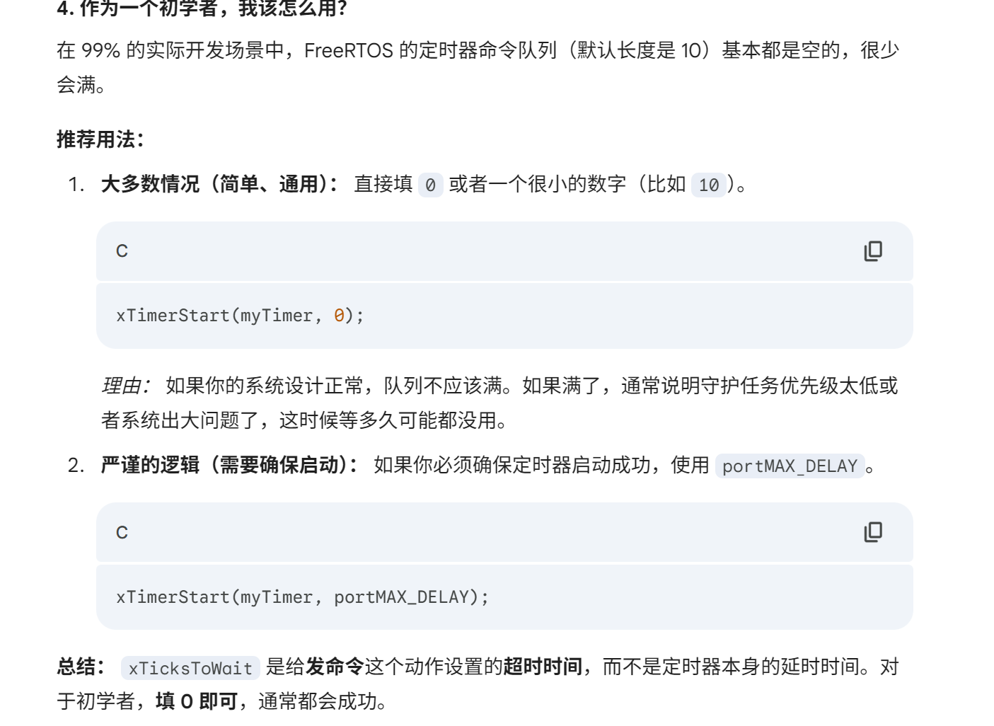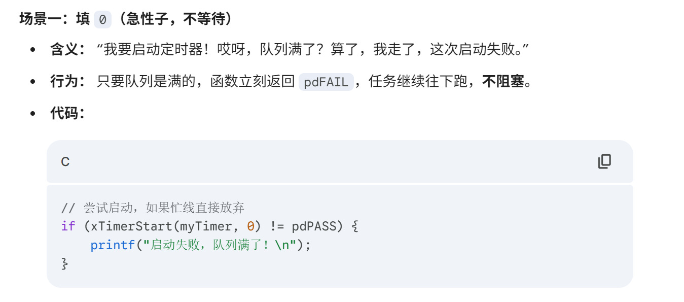 xTimerStart函数里有一个xTicksToWait参数。这个参数不是等待定时器启动的时间,而是等待命令写入队列的时间。如果队列满了,你的任务需要等待"管家"把队列里的旧命令处理完,腾出空间 。