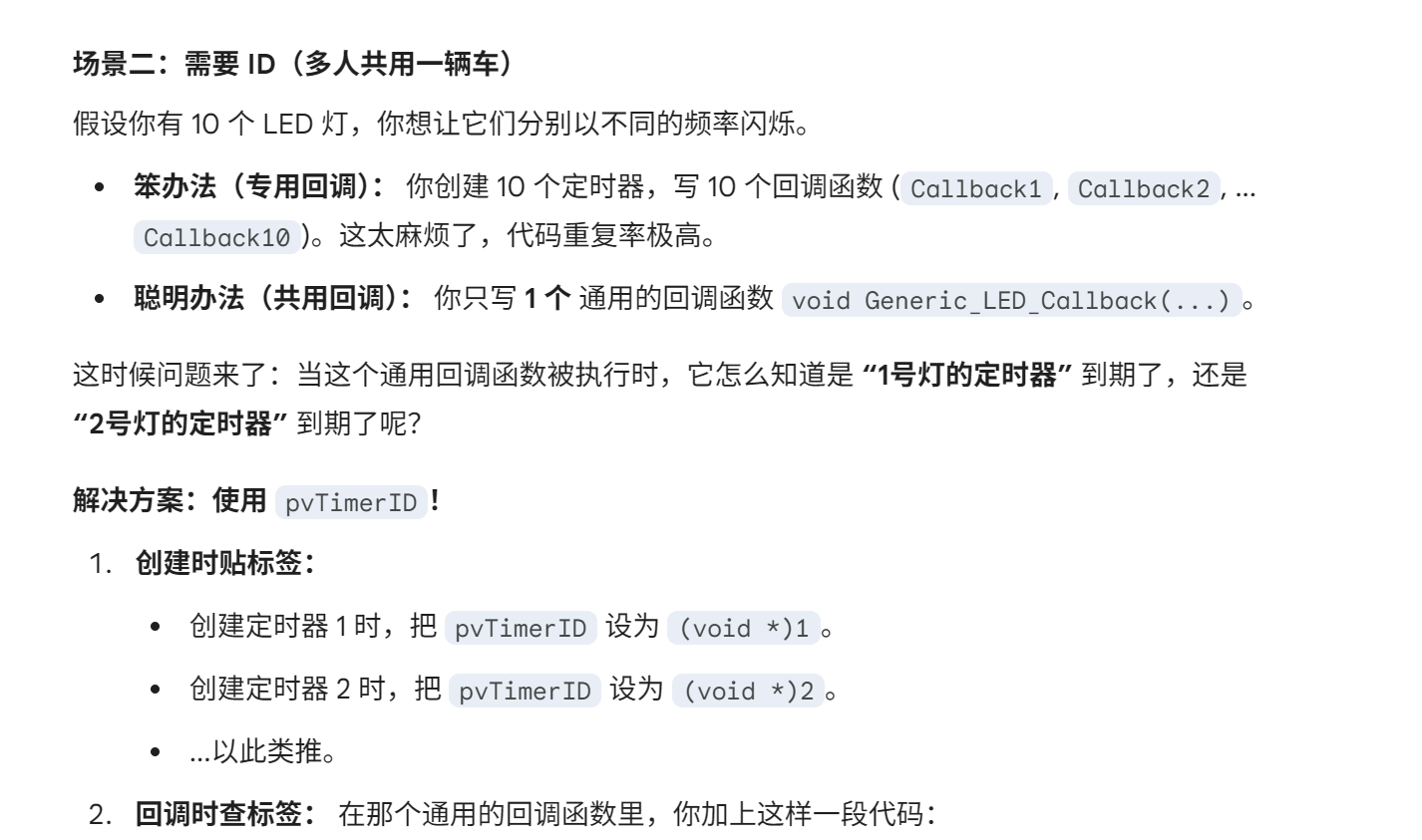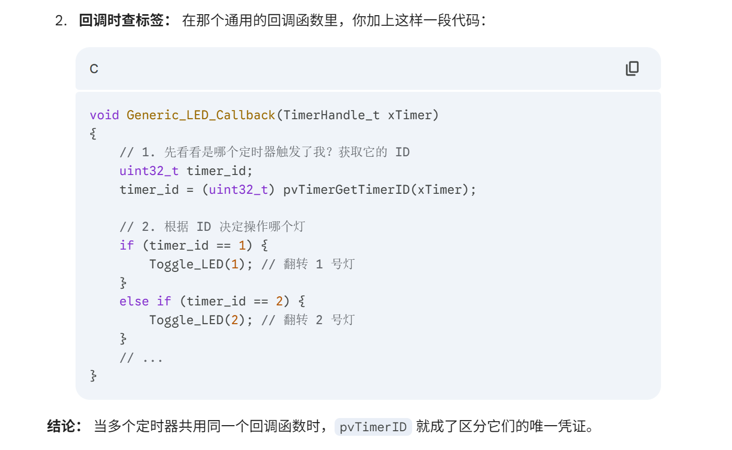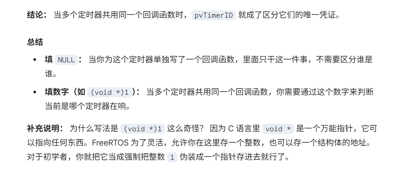 注意: 因为所有定时器都共用这个"守护任务",所以你的定时器回调函数决不能写死循环 ,也不能调用会导致阻塞的函数 (比如 vTaskDelay),否则会卡死其他所有的定时器 。