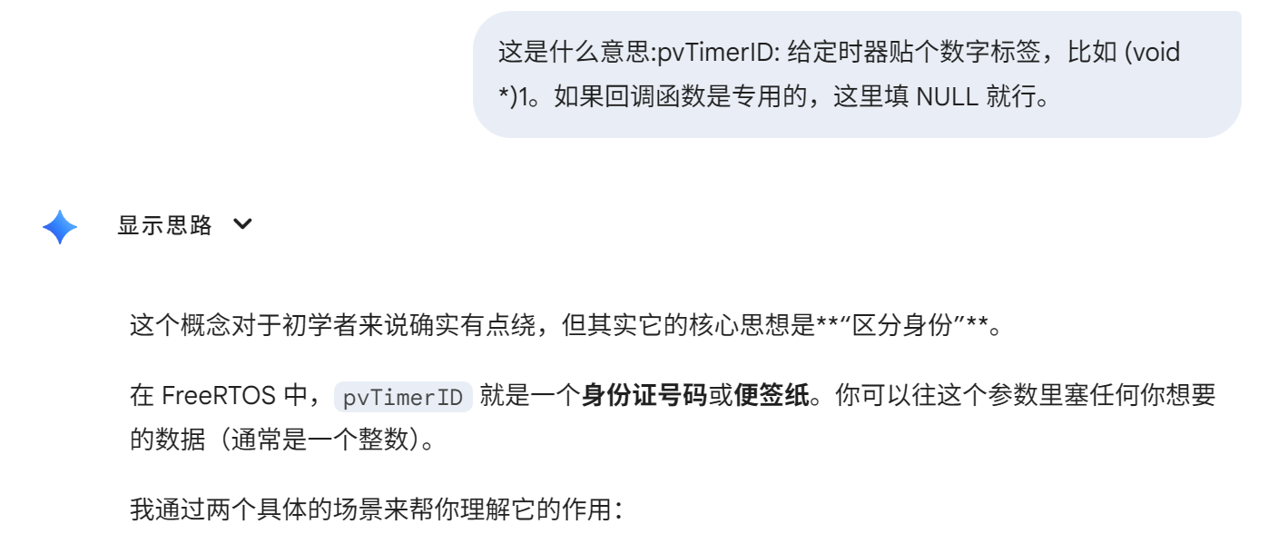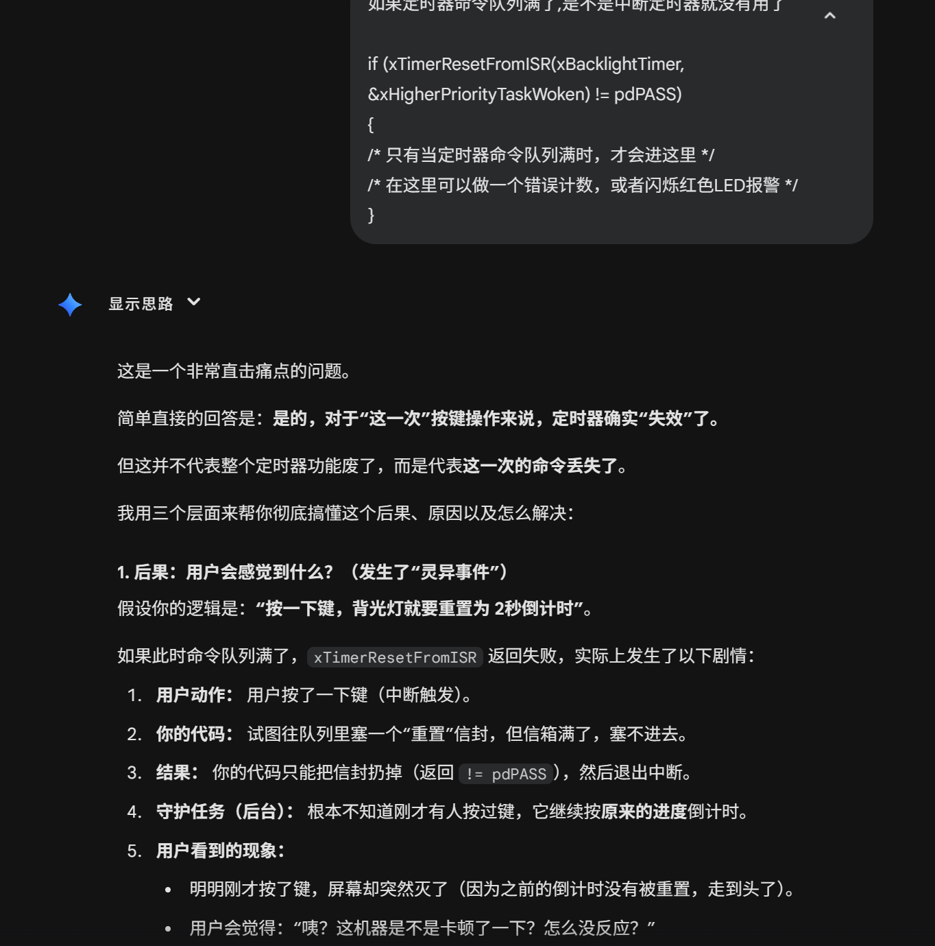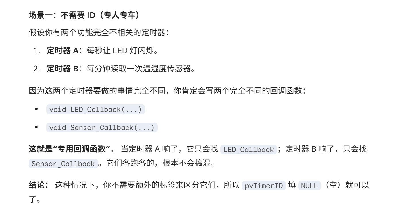 注意: 因为所有定时器都共用这个"守护任务",所以你的定时器回调函数决不能写死循环 ,也不能调用会导致阻塞的函数 (比如 vTaskDelay),否则会卡死其他所有的定时器 。
