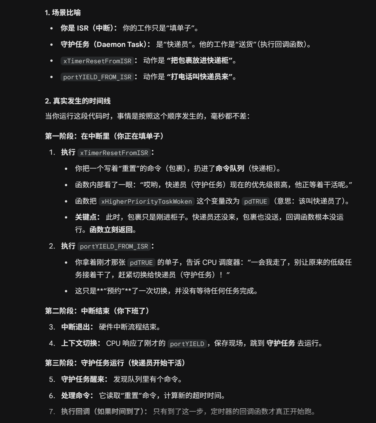 xTimerResetFromISR。FreeRTOS 内核发现:"哎哟,你发了命令,导致守护任务 (Daemon Task) 醒了!而且守护任务的优先级比 Task_Low 高!"- 此时,内核把