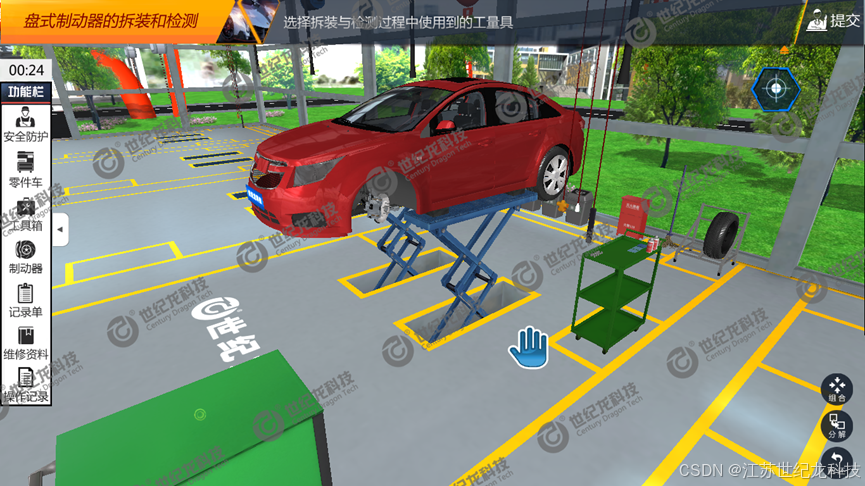 操作过程中,贴心的视角提示与清晰的操作指引如影随形,有效降低了学习门槛,帮助学生快速熟悉流程,建立操作信心。软件不仅真实模拟了万用表、千分尺、百分表等多种精密量具的使用,让学生在实践中掌握测量精髓;更完整复现了从车辆基础检查(如灯光、油液、轮胎)到系统维护(如机油更换、滤清器替换)的全套工艺流程。工具使用极具真实感,支持组合、设定力矩与旋向,甚至包含了垃圾分类与工位清洁等细节,全方位培养职业素养。