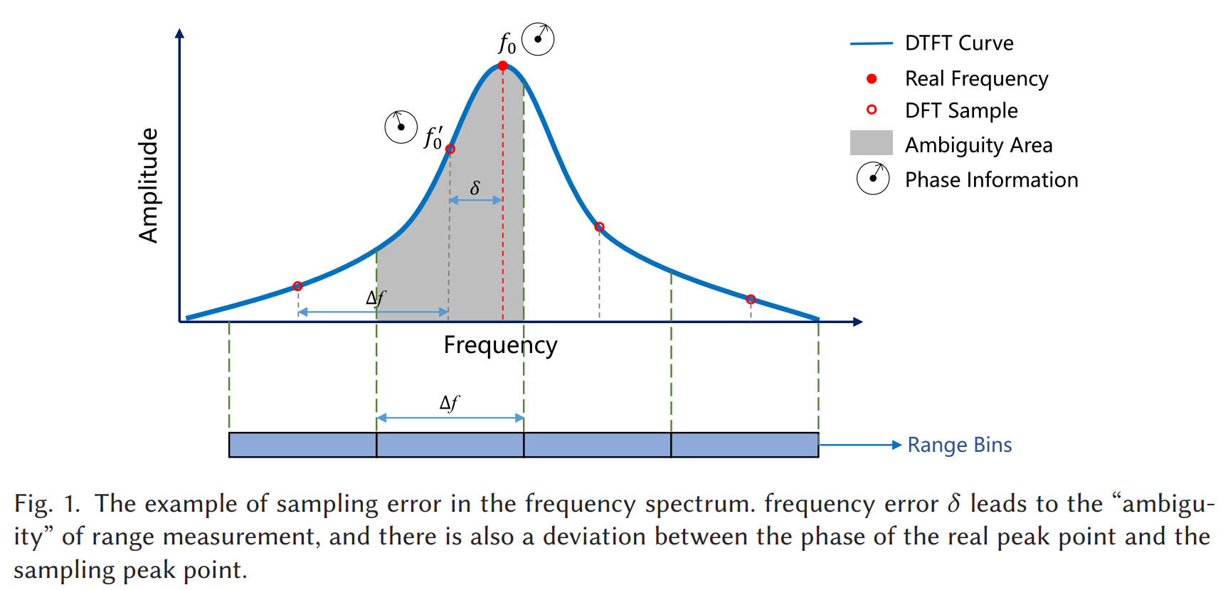 论文一上来就用 Fig.1 把关键矛盾画出来:蓝色是连续频谱,红点是 DFT 的离散采样点。真实峰值在连续频率 f0f_0f0 处,但我们只能在离散点里选最大值,于是把它当成 f^0\hat f_0f^0,产生频率误差 δ\deltaδ。这带来两件事:频率上出现"ambiguity area",距离上出现 range bin;此外,真实峰值点的相位 与采样峰值点的相位也不一致,从而 AoA 计算会偏。