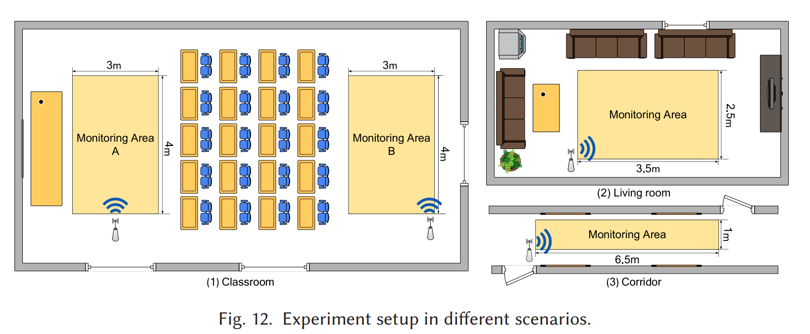 实验场景选了三种典型环境:空旷教室、家具较多客厅、狭窄走廊(Fig.12)。之所以不用人体做真值,是因为人体表面曲率复杂、多部位反射,难获得毫米级真值,所以用不同盒子绑在遥控小车上,通过小车轨迹得到更可对齐的参考。