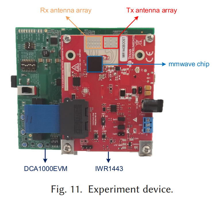 论文实现平台是 TI IWR1443BOOST + DCA1000EVM。配置上,Tx1 发 77--81 GHz FMCW,Rx1--Rx4 接收,chirp 时长 Tc=60 μsT_c=60\,\mu sTc=60μs,每个 chirp 采样点数 N=256N=256N=256,对应最大探测距离 10.2 m;数据通过 DCA1000EVM 实时抓取;用 LiDAR 做地面真值;帧率设置为 50 Hz(每 0.02 s 输出一次定位)。