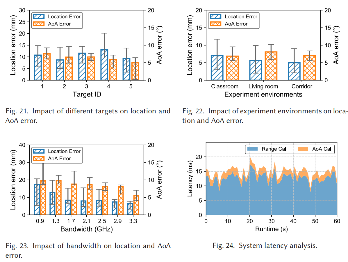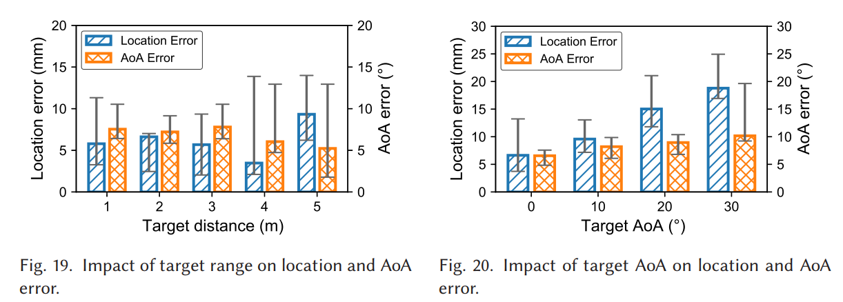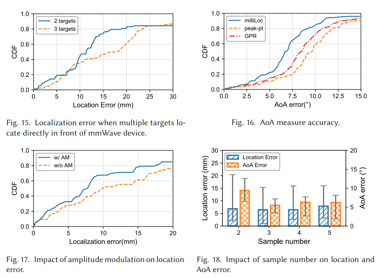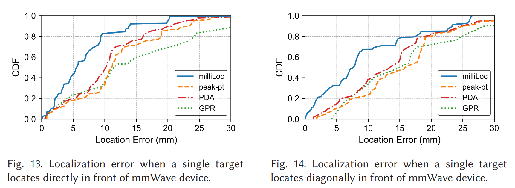 单目标、AoA<5° 时,论文报告 milliLoc 的中位定位误差 5.5 mm;peak-pt、PDA、GPR 分别为 11.1 mm、10.2 mm、11.8 mm。更值得注意的是误差分布(CDF)的整体左移:这通常意味着误差不是少数点改善,而是整体概率意义上的改善。