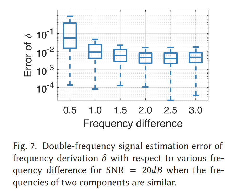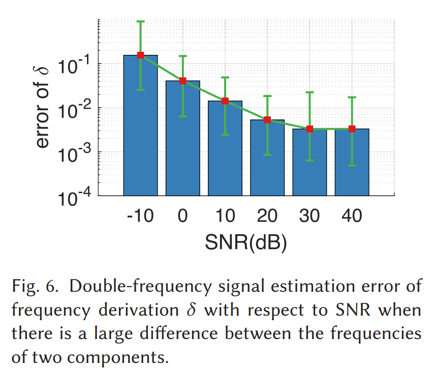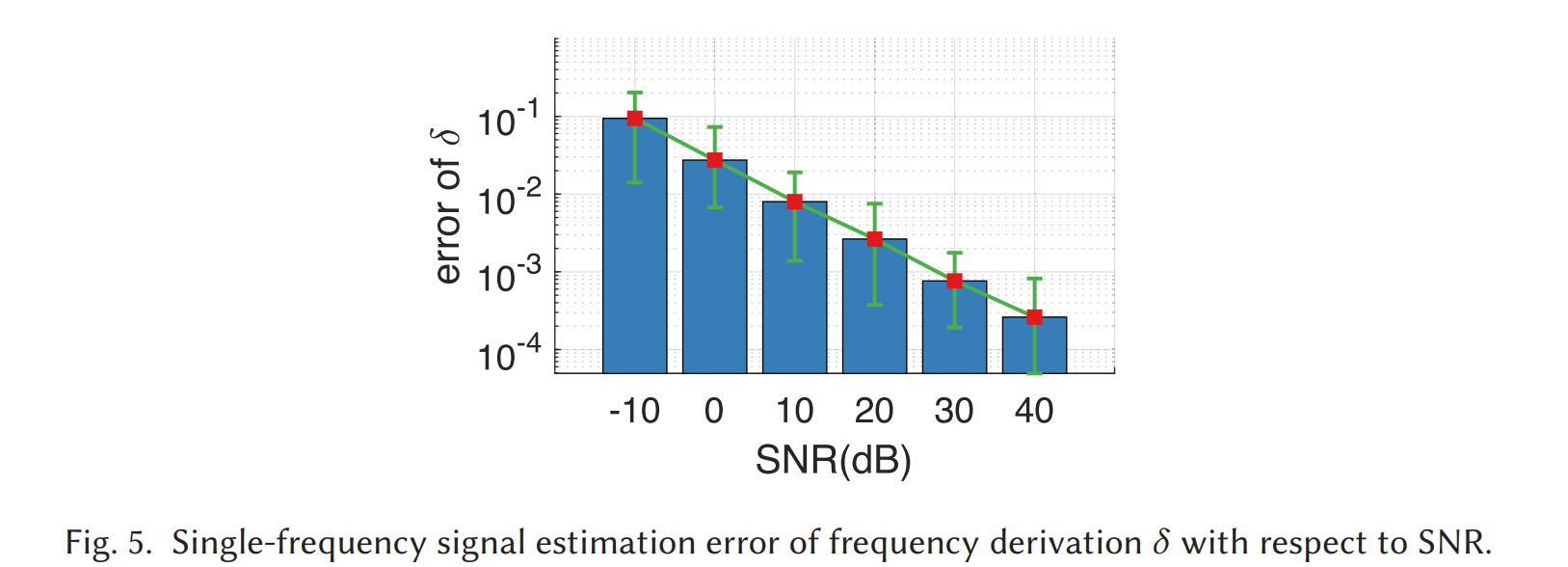 论文在仿真中用单频 + 白噪声,展示了 δ\deltaδ 的估计误差随 SNR 的下降趋势,并强调:SNR=10 dB 时 δ\deltaδ 的中位误差约 0.01,而在 4 cm/bin 的情况下,这意味着约 0.01×4 cm=0.4 mm0.01\times 4\text{ cm}=0.4\text{ mm}0.01×4 cm=0.4 mm 的中位测距误差(理想条件)。