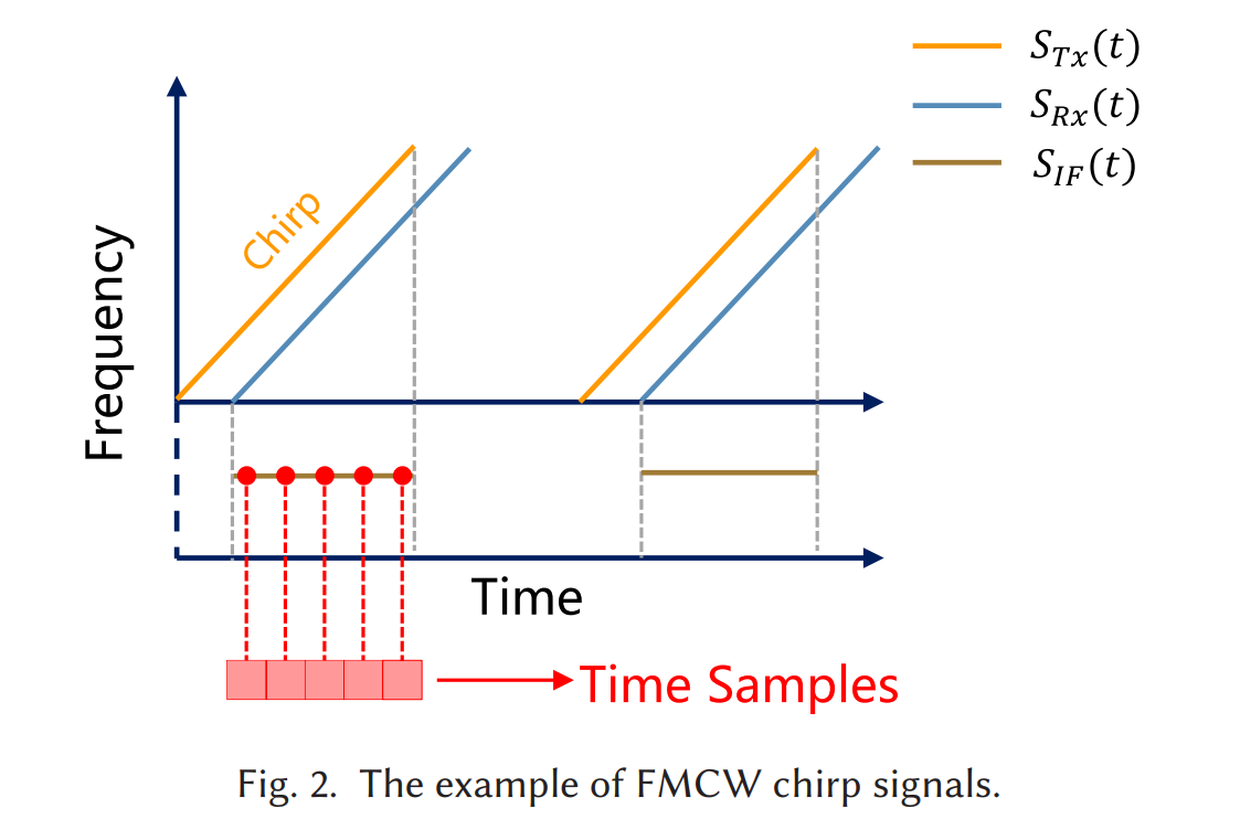这条式子就是"只要带宽 BBB 不变,距离分辨率就被卡死"的根源。论文用 77--81 GHz、约 4 GHz 带宽的商用设备举例,Δd\Delta dΔd 约为 4 cm,因此同一 range bin 内的目标都会输出同一个距离,形成距离模糊。