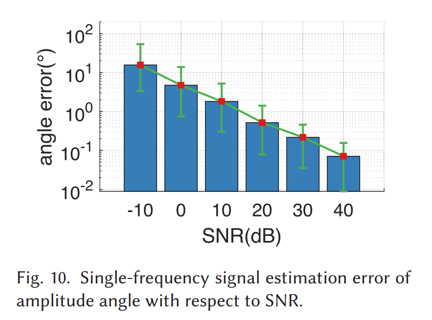 它的含义非常直接:从峰点读到的相位其实是"真实初相 + 一个由 δ\deltaδ 决定的附加相位"。只要 δ\deltaδ 不是整数(基本不会是),这个附加相位就不为 0,于是 AoA 会出现系统偏差。这一点对应 Fig.10:论文用仿真展示通过谱峰重构估计出的初相 θ0\theta_0θ0 误差随 SNR 的变化,SNR>20 dB 时中位角误差 < 1∘1^\circ1∘。