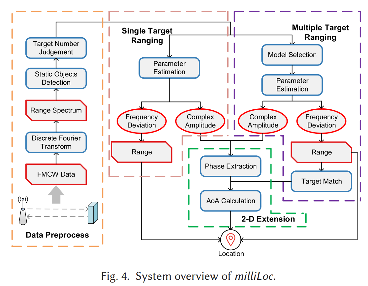 同一页还有 Fig.4 的系统总览图:预处理得到 range spectrum;先做静态物体影响抑制;再分单目标/多目标的测距;最后用复幅度信息改进 AoA 并做 2D 定位。