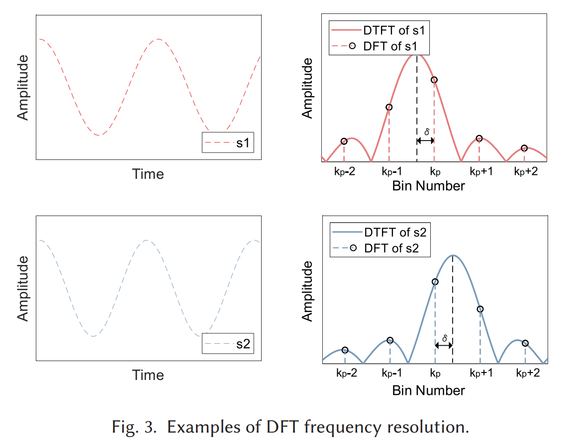 接着作者用 Fig.3 举例:两个信号 s1,s2s_1,s_2s1,s2 的真实频率分别是 kp−δN\frac{k_p-\delta}{N}Nkp−δ 与 kp+δN\frac{k_p+\delta}{N}Nkp+δ,尽管不同,但峰值 bin 都落在 kpk_pkp,于是传统峰点法会判为相同;然而它们在 kp−1,kp,kp+1k_p-1,k_p,k_p+1kp−1,kp,kp+1 的幅度分布并不相同,这正是可被利用的信息。