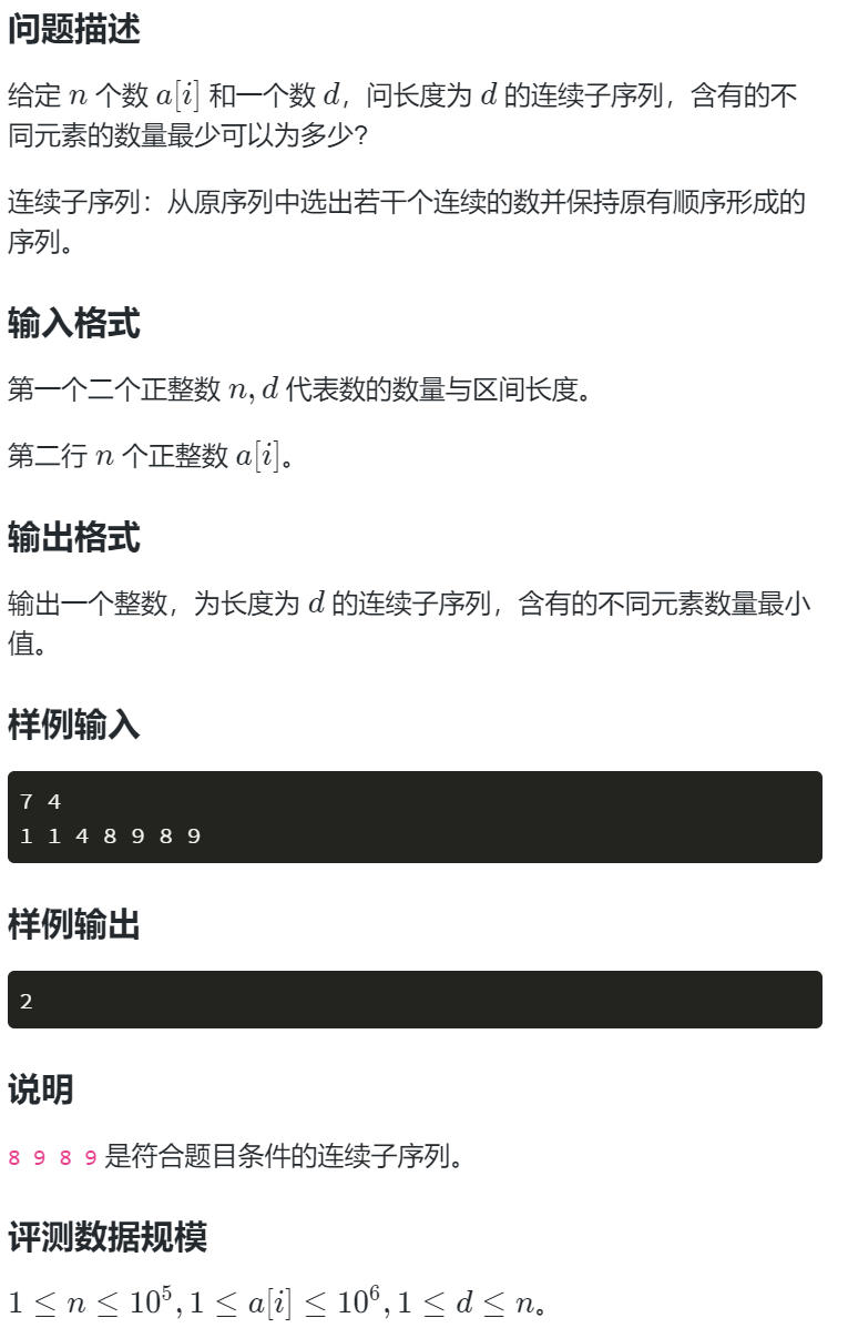 思路:我们可以用滑动窗口来统计每个长度为d的窗口内不同元素的个数,然后取最小值。