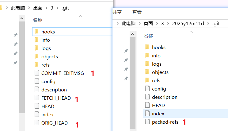 packed-refs):Git自动生成的优化文件,反映左侧仓库分支/标签较多,存储更高效; - 操作残留文件(仅右侧有3个):是右侧仓库近期执行特定操作的痕迹,不影响仓库功能,但能看出近期有活跃的Git操作(提交、拉取、合并等)。