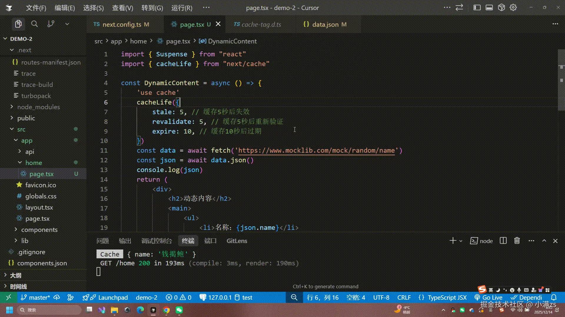 缓存组件,可以使用use cache声明这是一个缓存组件,然后使用cacheLife声明缓存时间。