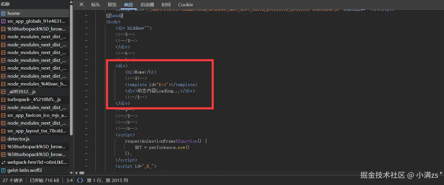 <h1>Home</h1>: 纯静态内容,属于静态外壳的一部分,构建 / 请求时直接渲染,浏览器能立即显示。 -
