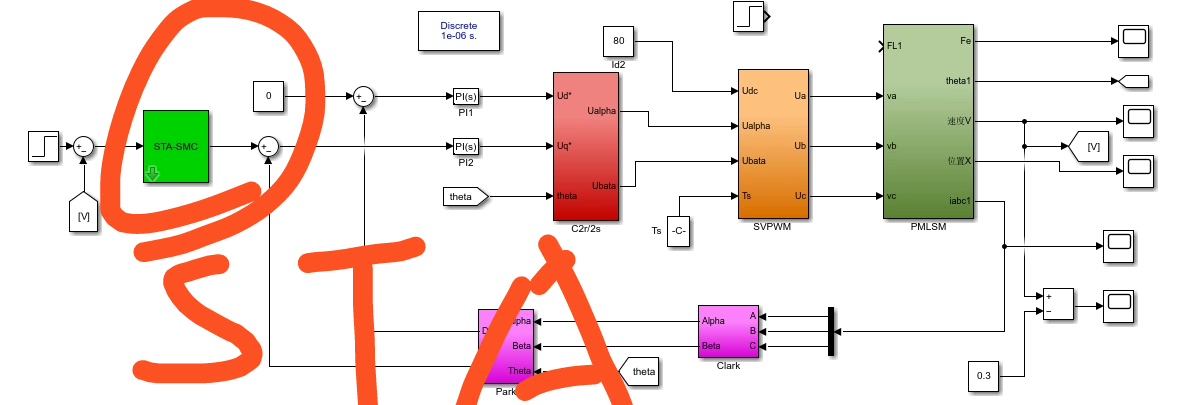 在这个STA - SMC的代码实现中,定义了参数 alpha 和 beta 。stasmccontrol 函数里,先计算状态误差 e ,构建滑模面 s 。这里控制输入 u 由两部分组成,u1 是和滑模面相关的一项,通过积分项 z 不断更新,最终组合成总的控制输入 u 。这种方式使得控制输入更加平滑,大大减轻了抖振现象,让永磁同步直线电机(PMLSM)能够更加稳定地运行。