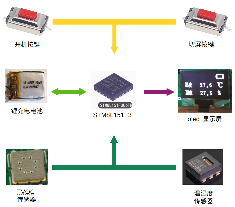 手持式 VOC 检测设备基于 Chaos-nano 操作系统与 STM8L151F3 芯片构建,针对老人与孕妇的使用习惯,采用"极简设计+核心功能聚焦"的模块化结构,核心组成包括: