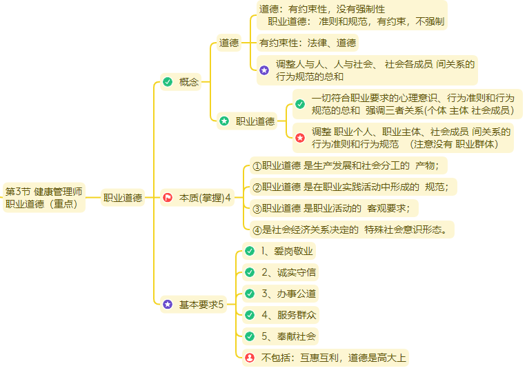 职业道德:调整 职业个体、职业主体、社会成员 之间关系的 行为准则 和行为规范。