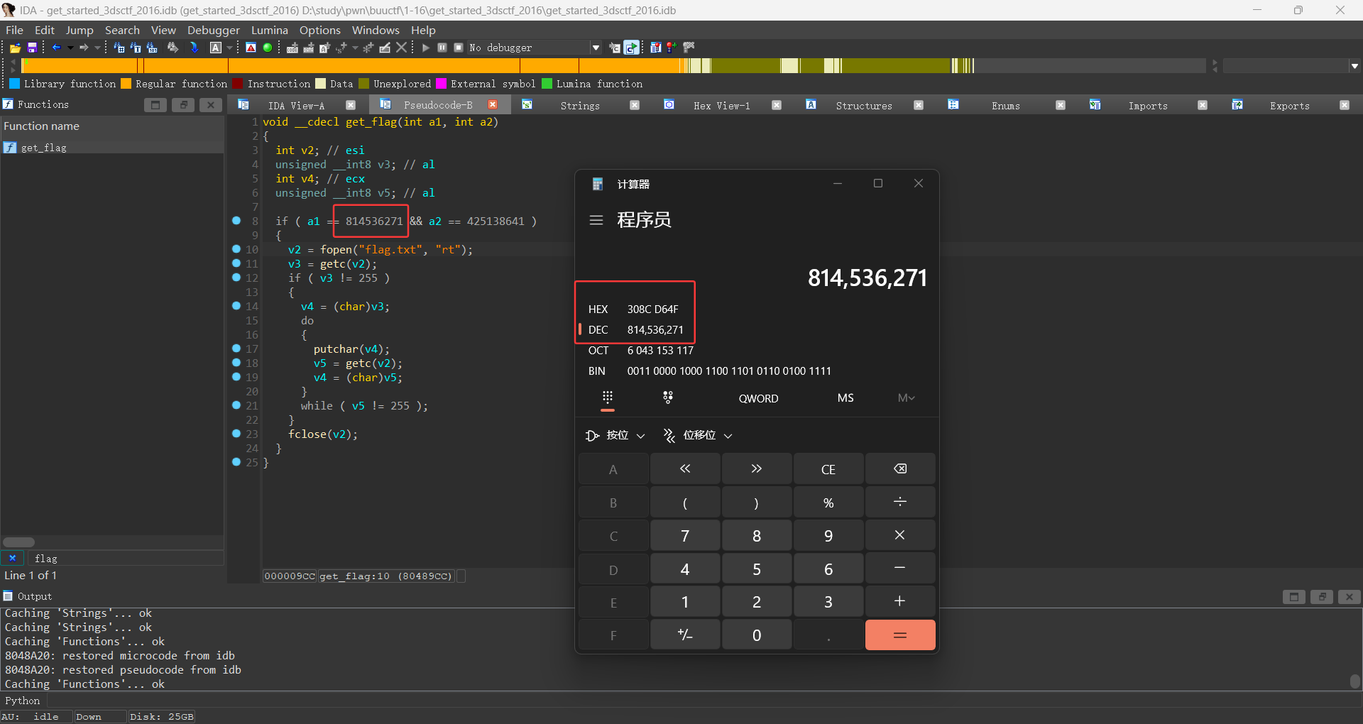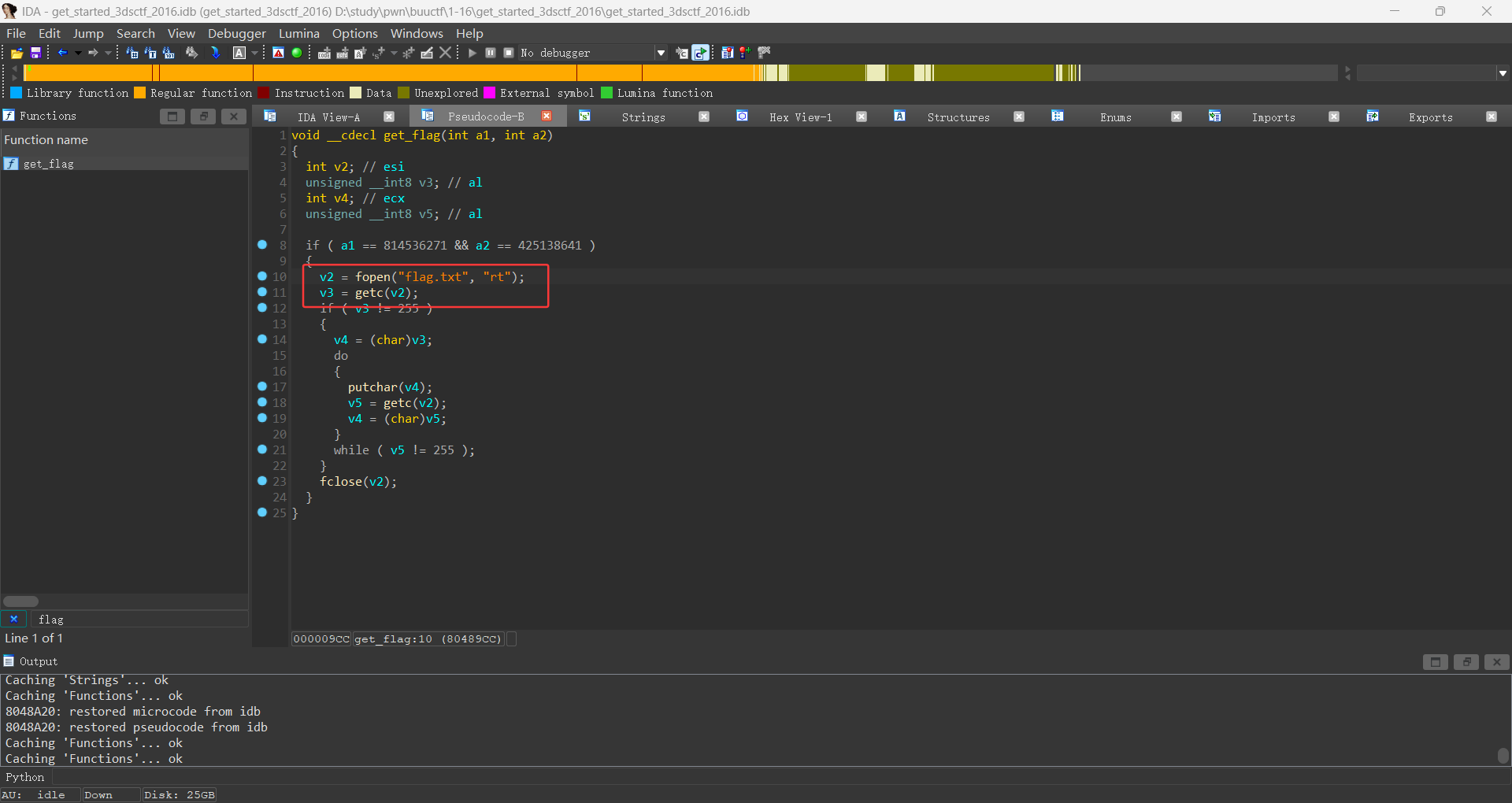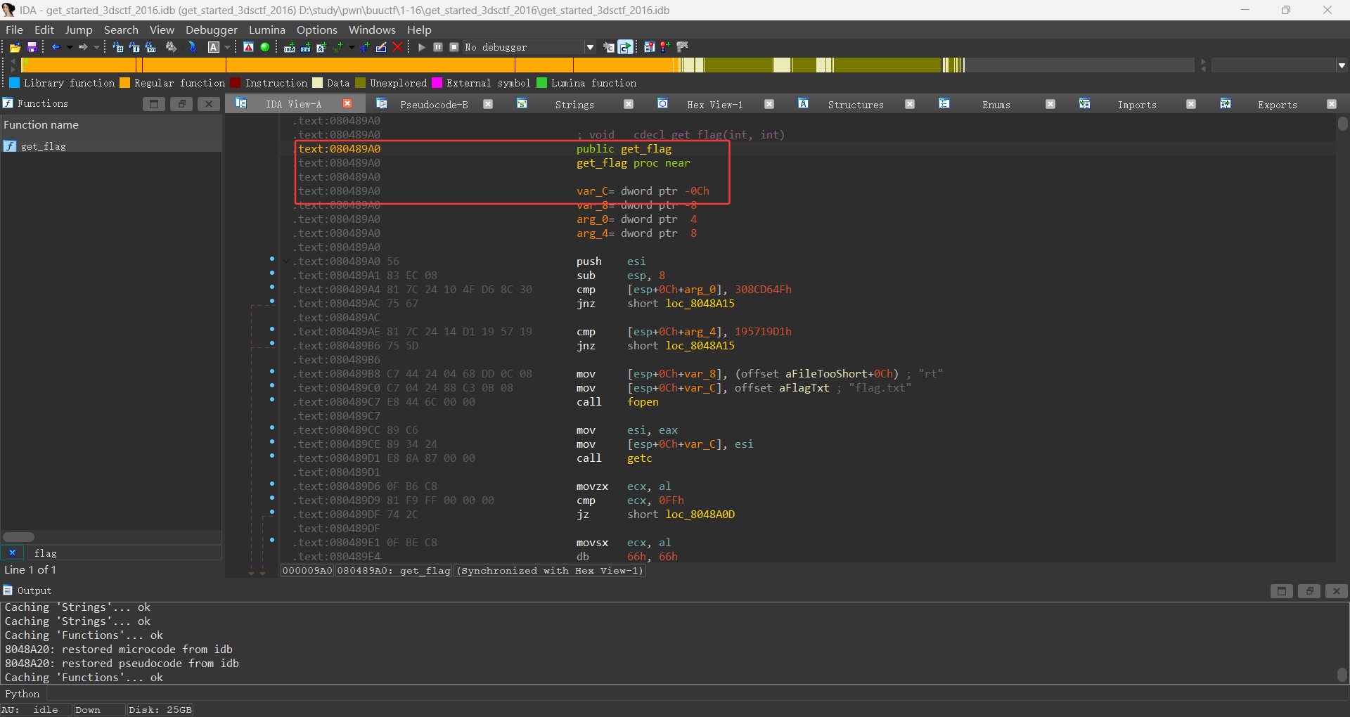 搜索发现有个get_flag函数,满足条件会执行打开flag.txt的指令