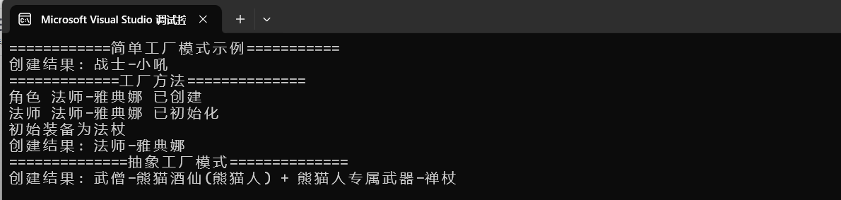 auto SimpleWarrior = SimpleFactory::CreateCharacter(CharacterType::WARRIOR, "战士-小吼");