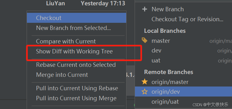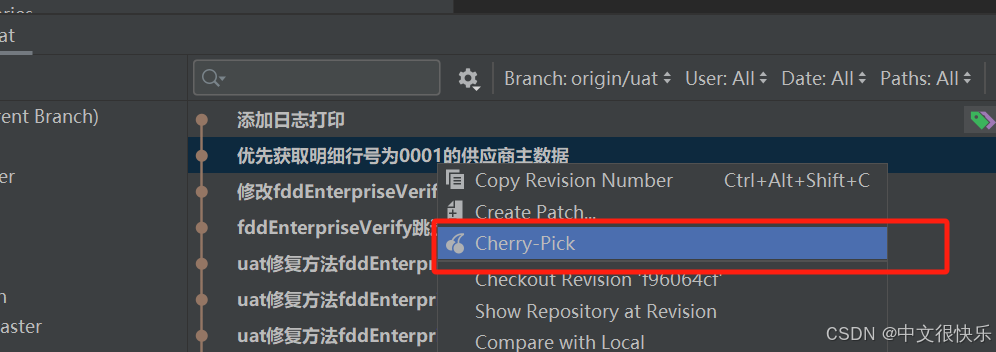 1.将uat分支指定的某一次分支合并到dev分支来: