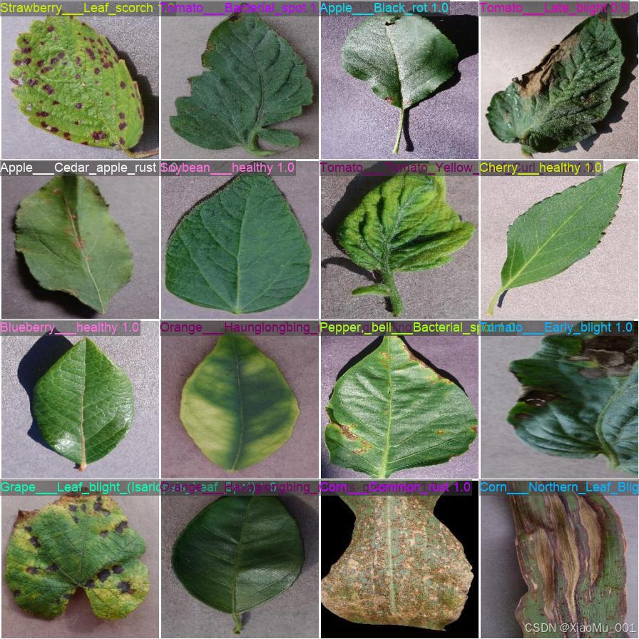 可视化结果显示,模型能够准确框定叶片中的病斑区域(如有)或识别整叶状态,并给出高置信度的分类标签,验证了模型的实际应用能力。
