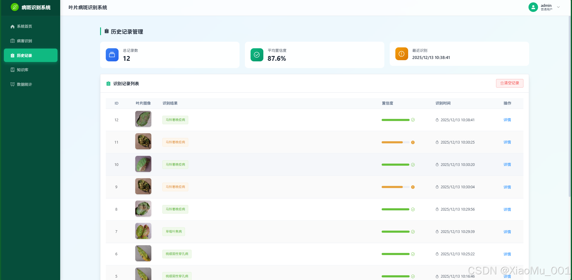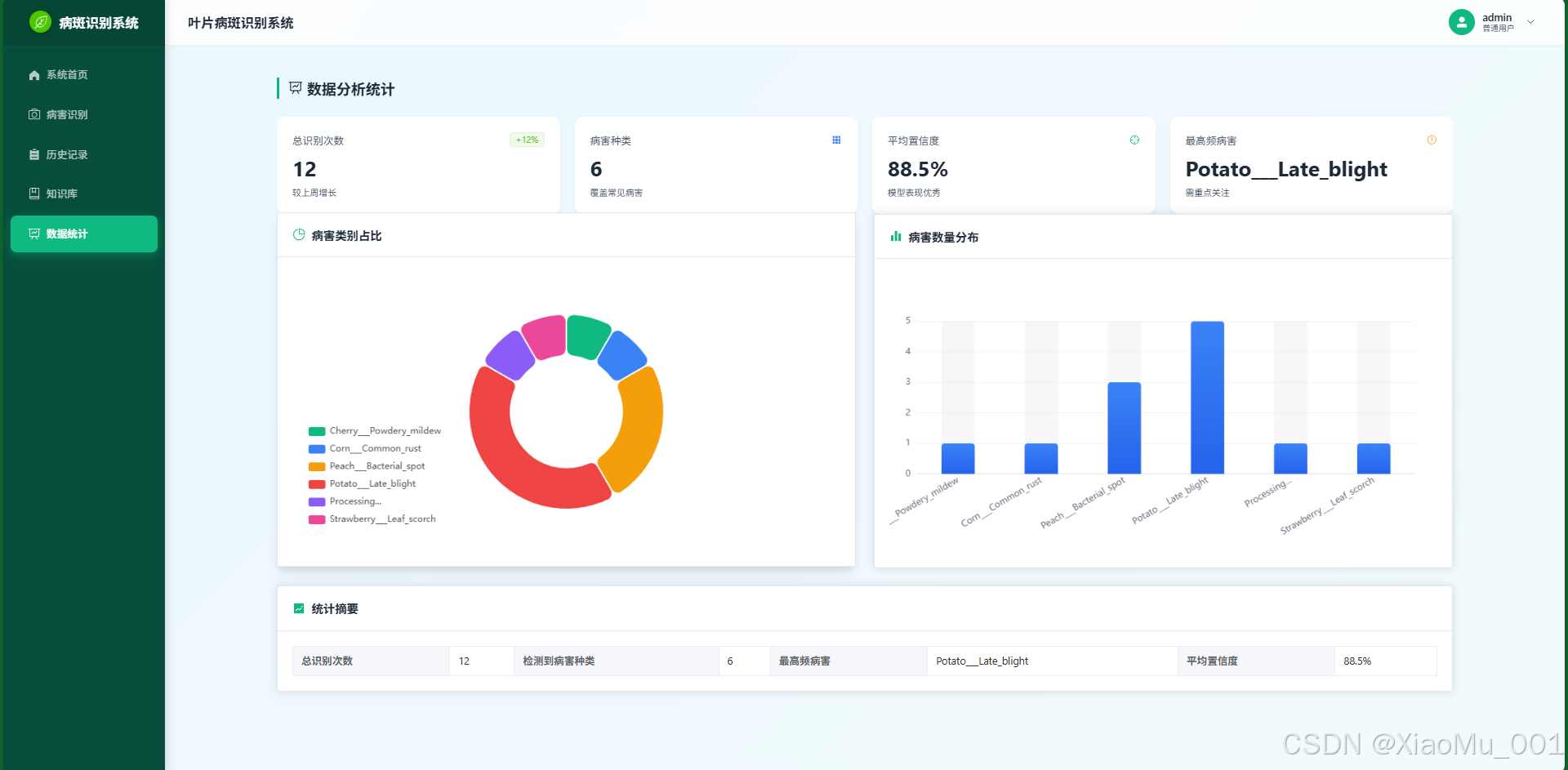 - 统计分析 : 仪表盘通过图表展示病害发生趋势和类别占比,辅助农业决策。