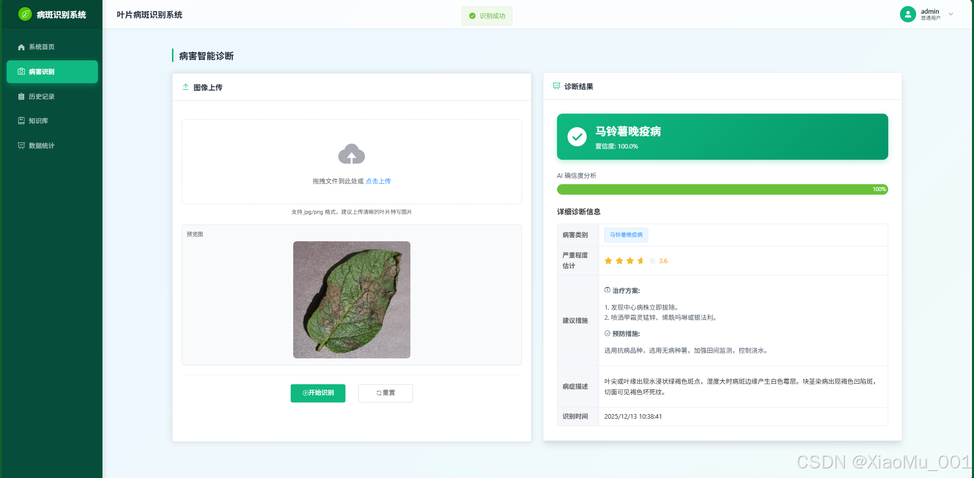 - 建立了结构化的病害知识库,实现了识别结果与防治方案的智能关联。