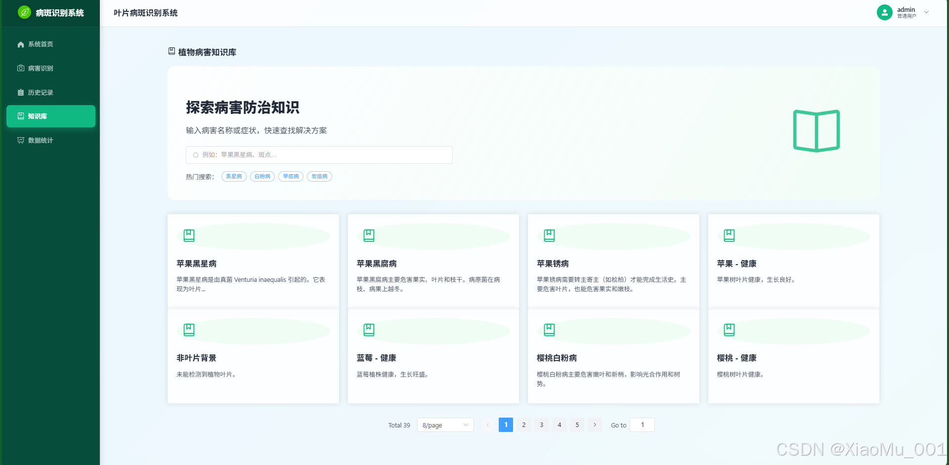 - 数据可视化 : 引入 ECharts 图表库,将病害识别历史和统计数据以饼图、柱状图等形式直观展示,帮助用户快速理解数据。