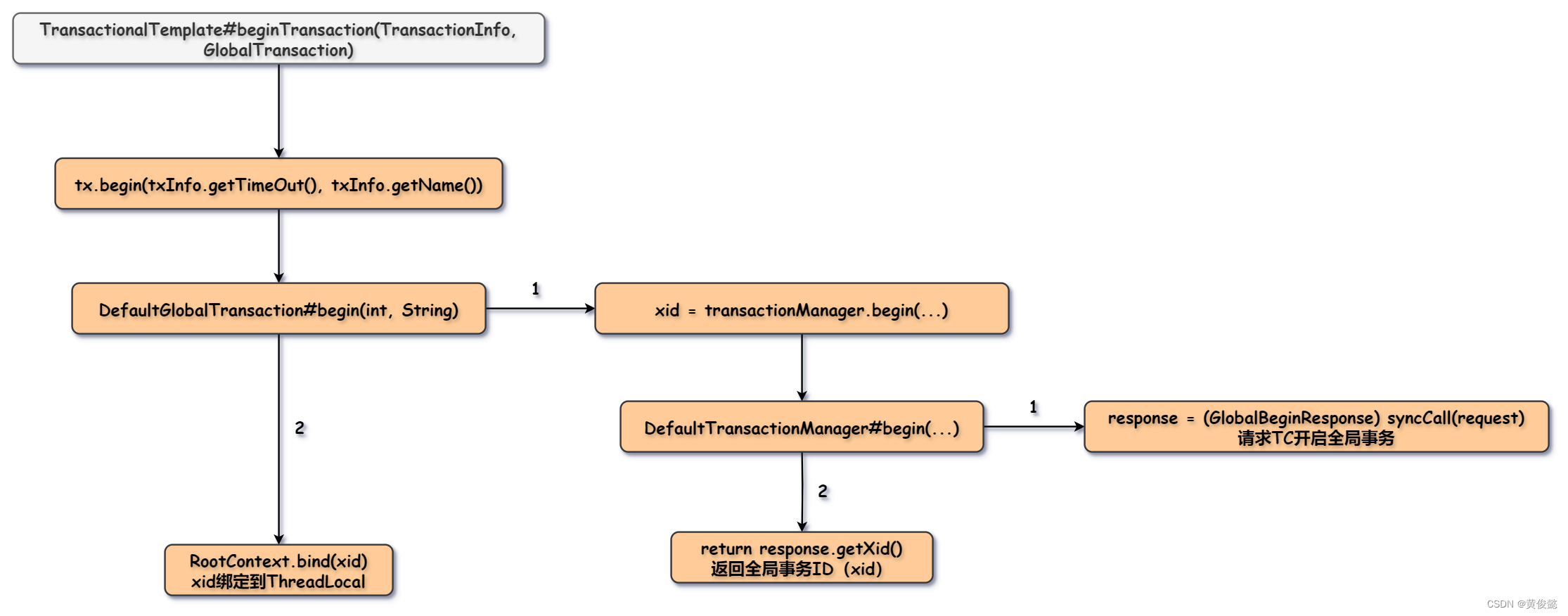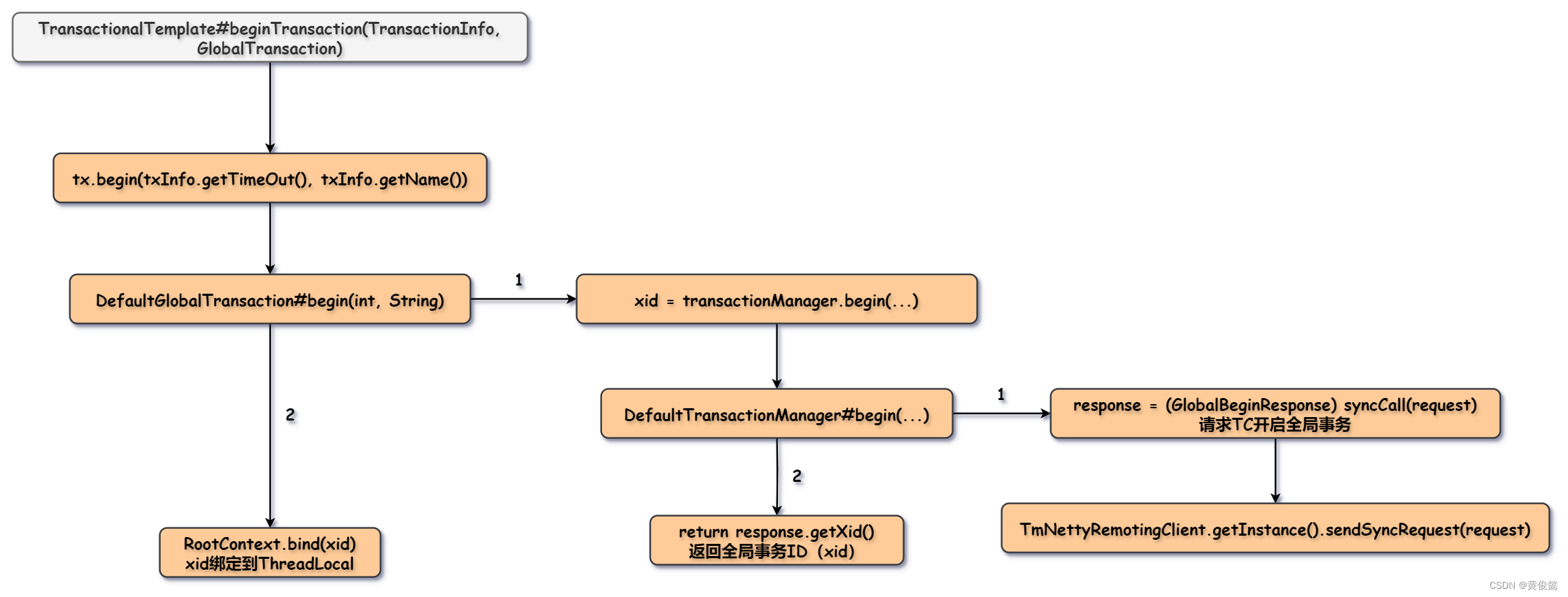 DefaultTransactionManager的begin方法调用syncCall方法请求TC开启全局事务,然后返回response对象中的xid。