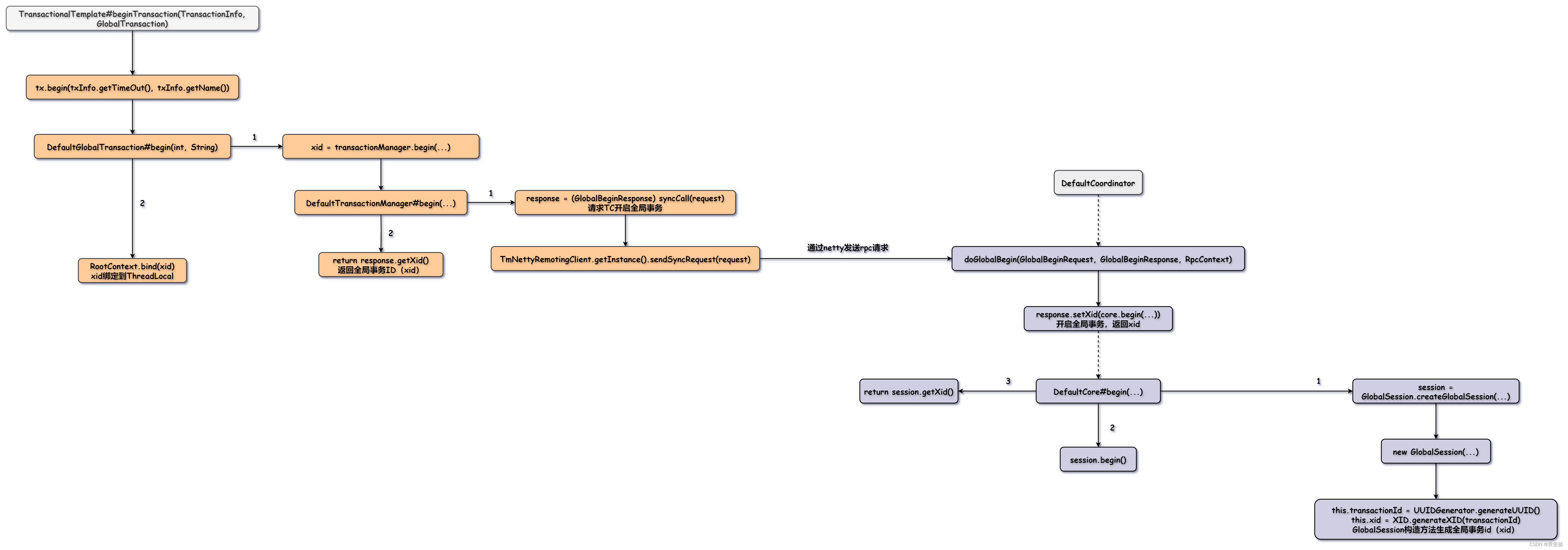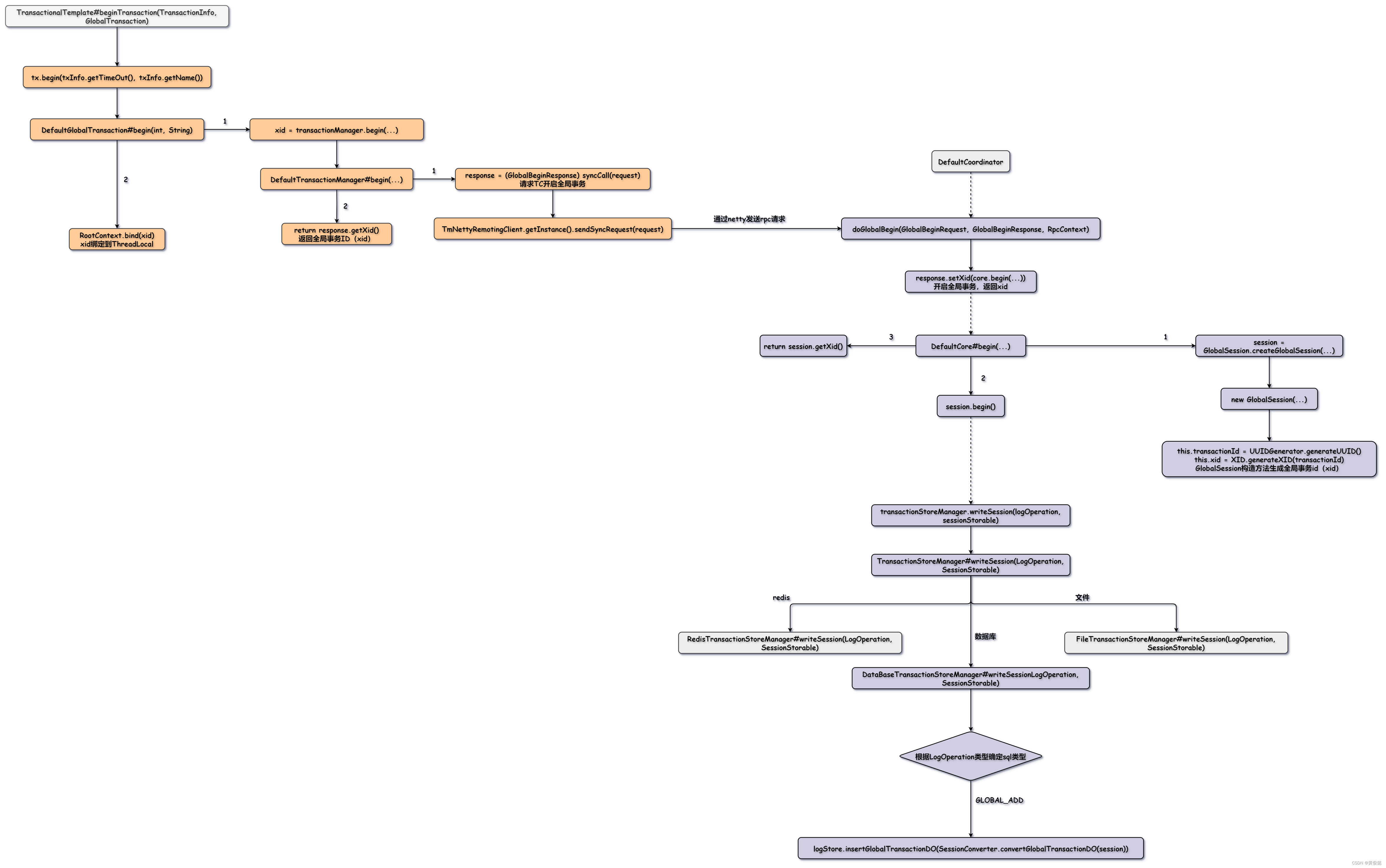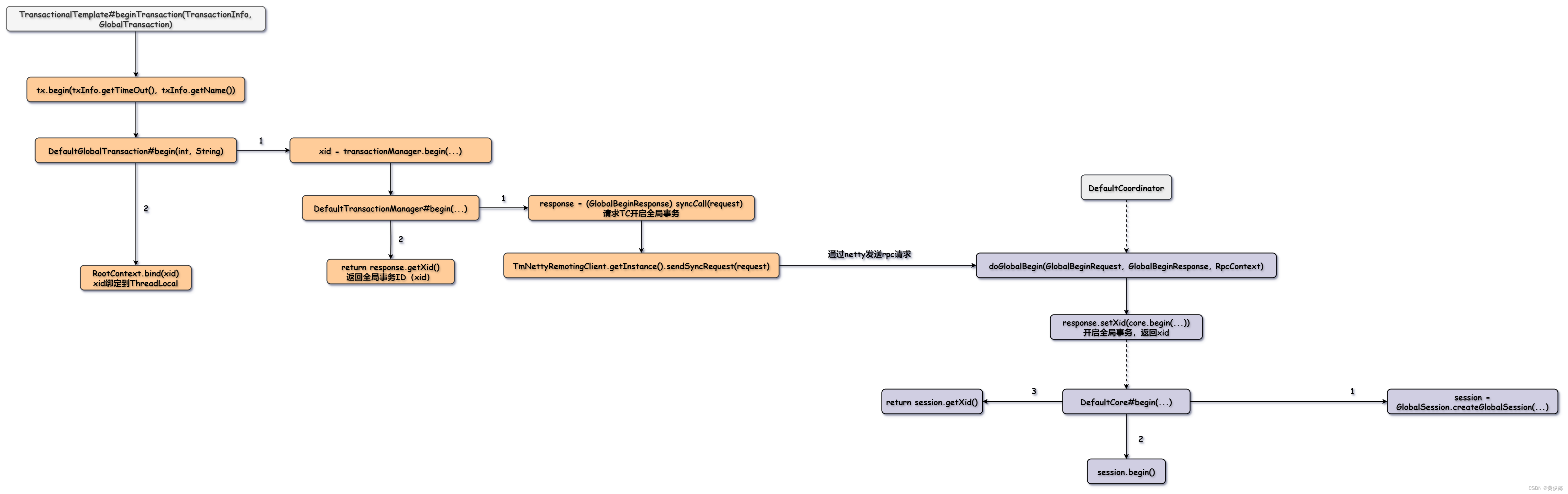 DefaultGlobalTransaction的begin方法就是调用transactionManager的begin方法请求TC开启全局事务,TC会返回一个xid,然后DefaultGlobalTransaction把xid存入到ThreadLocal中与当前线程绑定。