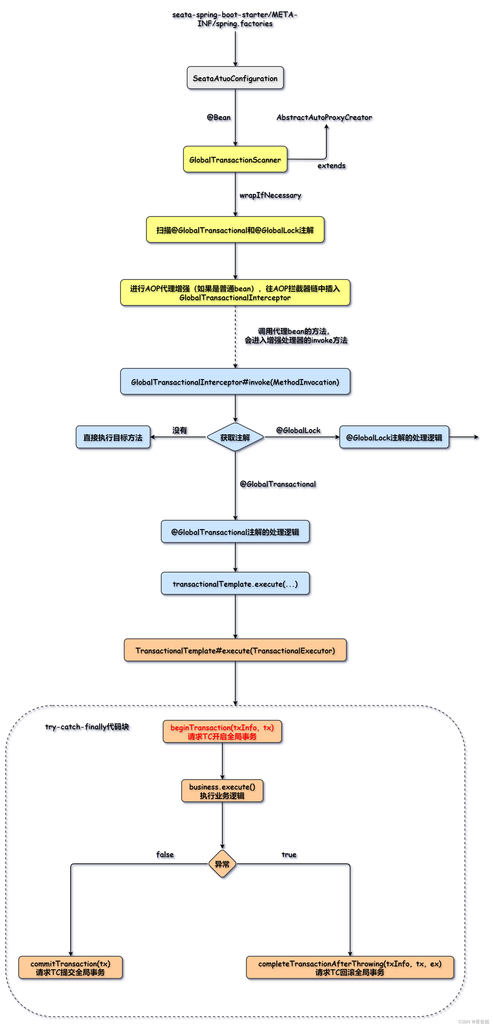 - TransactionalTemplate的execute方法在try-catch代码块中事务的模板代码:开启全局事务、执行业务逻辑、全局事务回滚(如果报错)、全局事务提交。