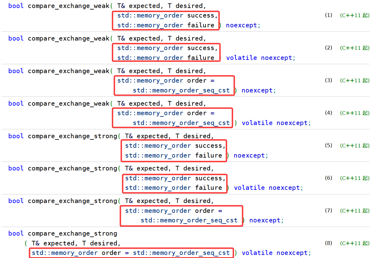 | compare_exchange_weak/strong | 比较并交换(CAS):核心原子操作,实现无锁算法的基础 |