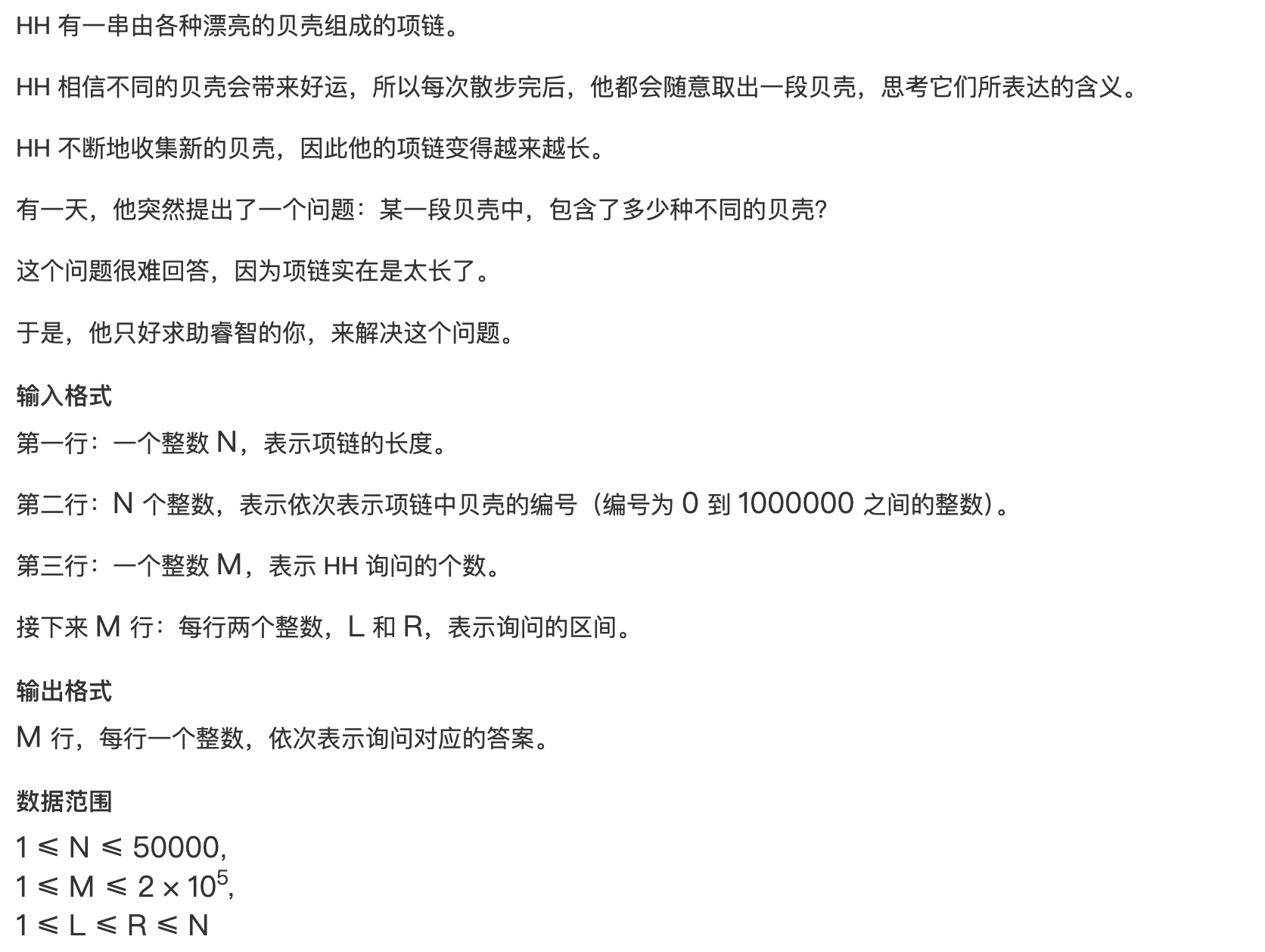 假设最坏情况下, 每次查询一个区间 n n n, 开一个数组用于记录每个数字出现的次数 , 算法时间复杂度 O ( q n ) O(qn) O(qn), 无法通过