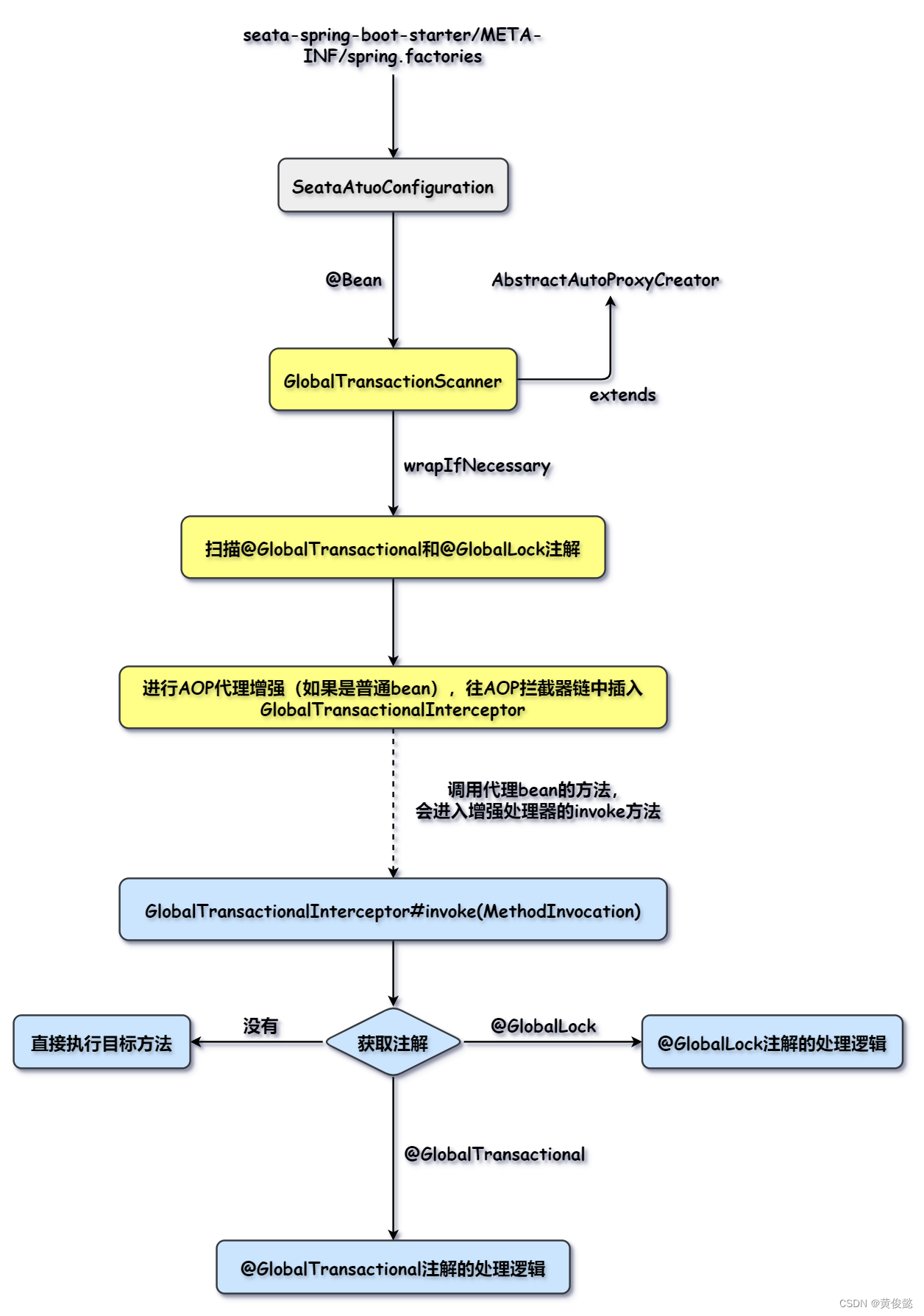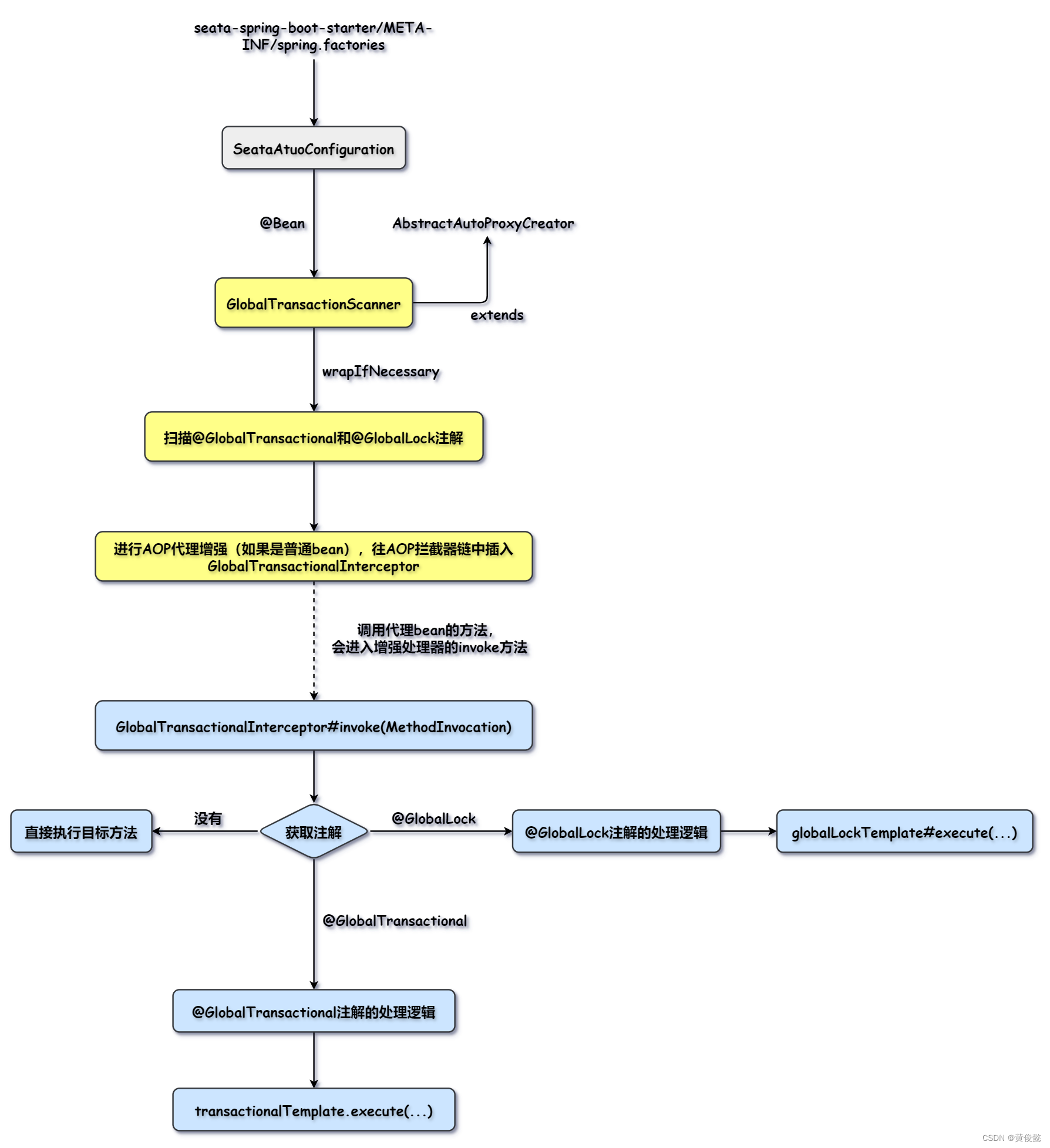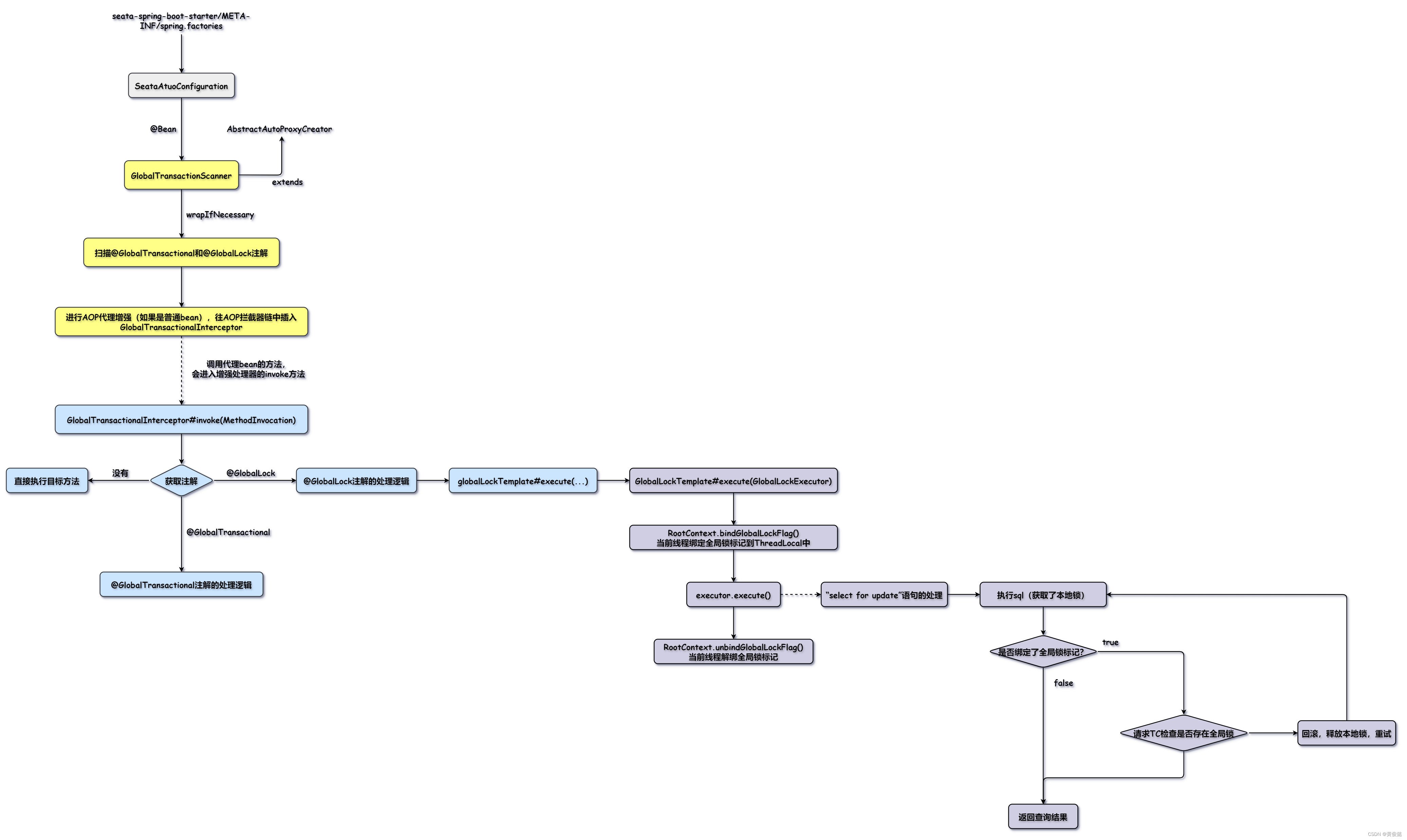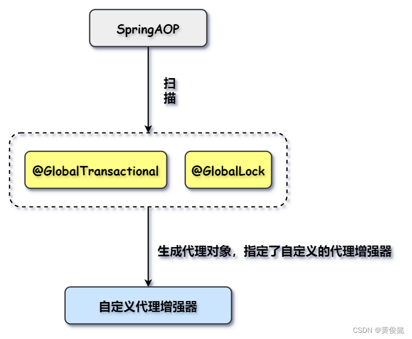 seata是基于SpringAOP实现的,通过SpringAOP的扩展点扫描@GlobalTransactional注解和@GlobalLock注解,生成代理对象,指定了自定义的代理增强器。