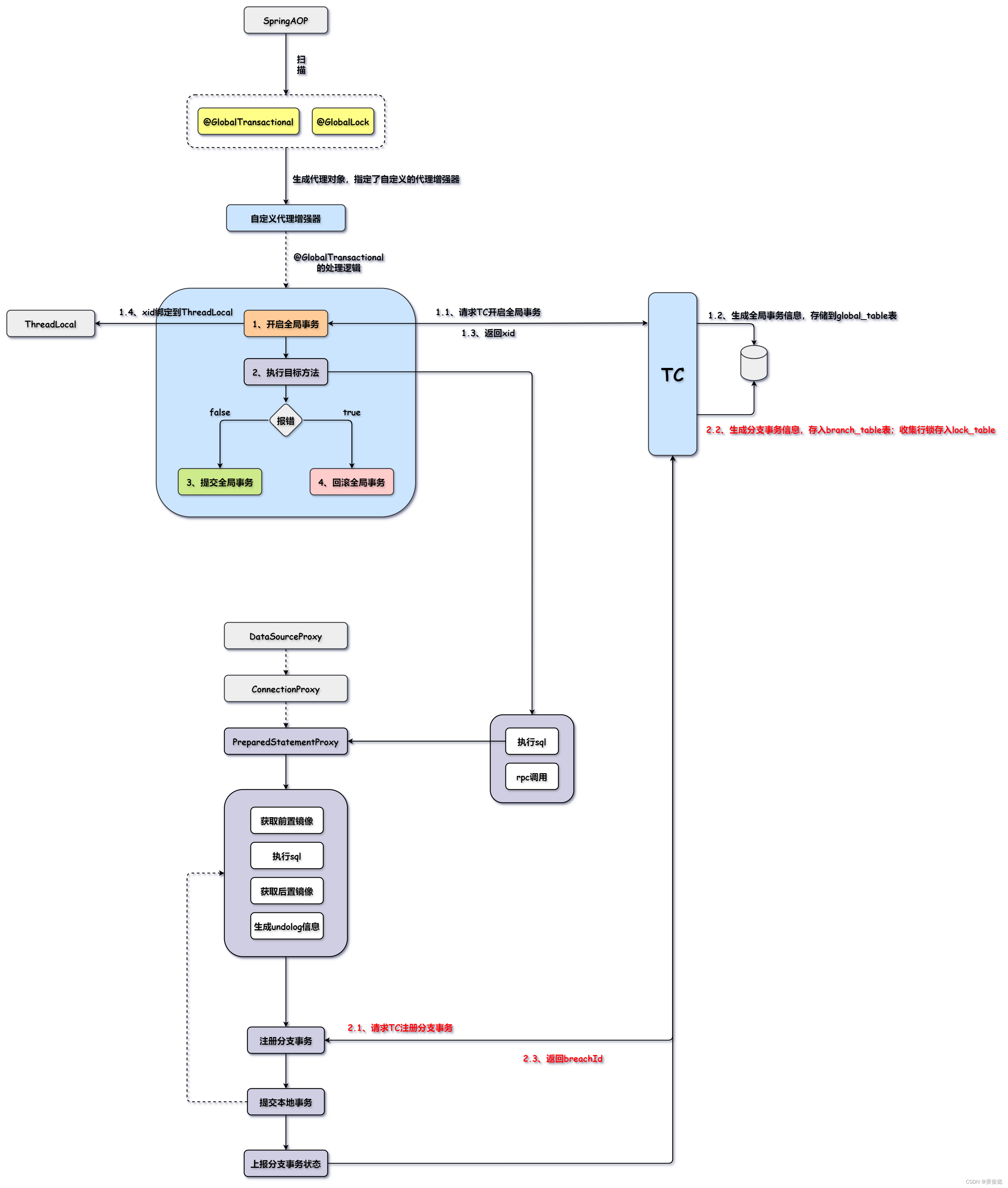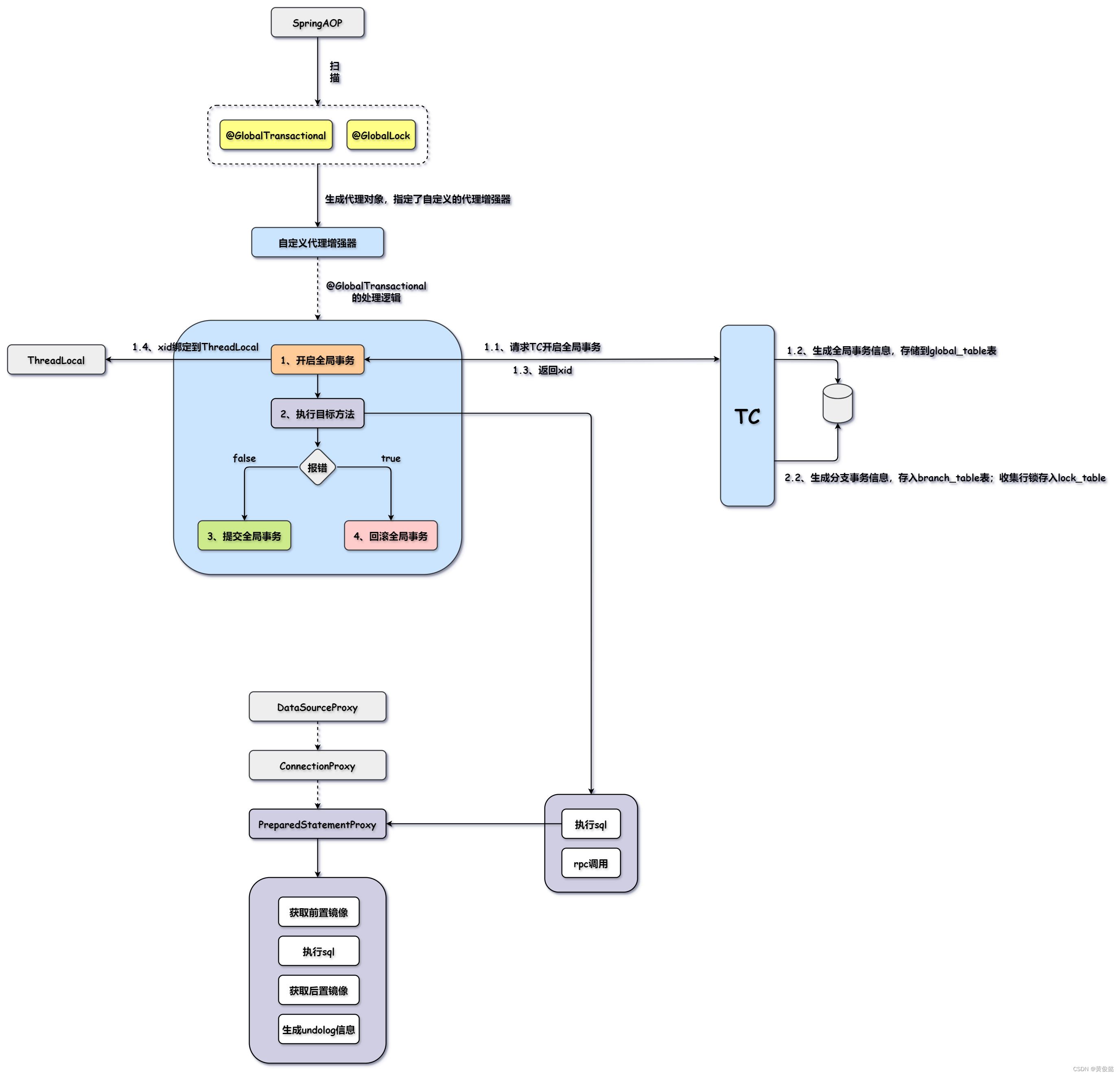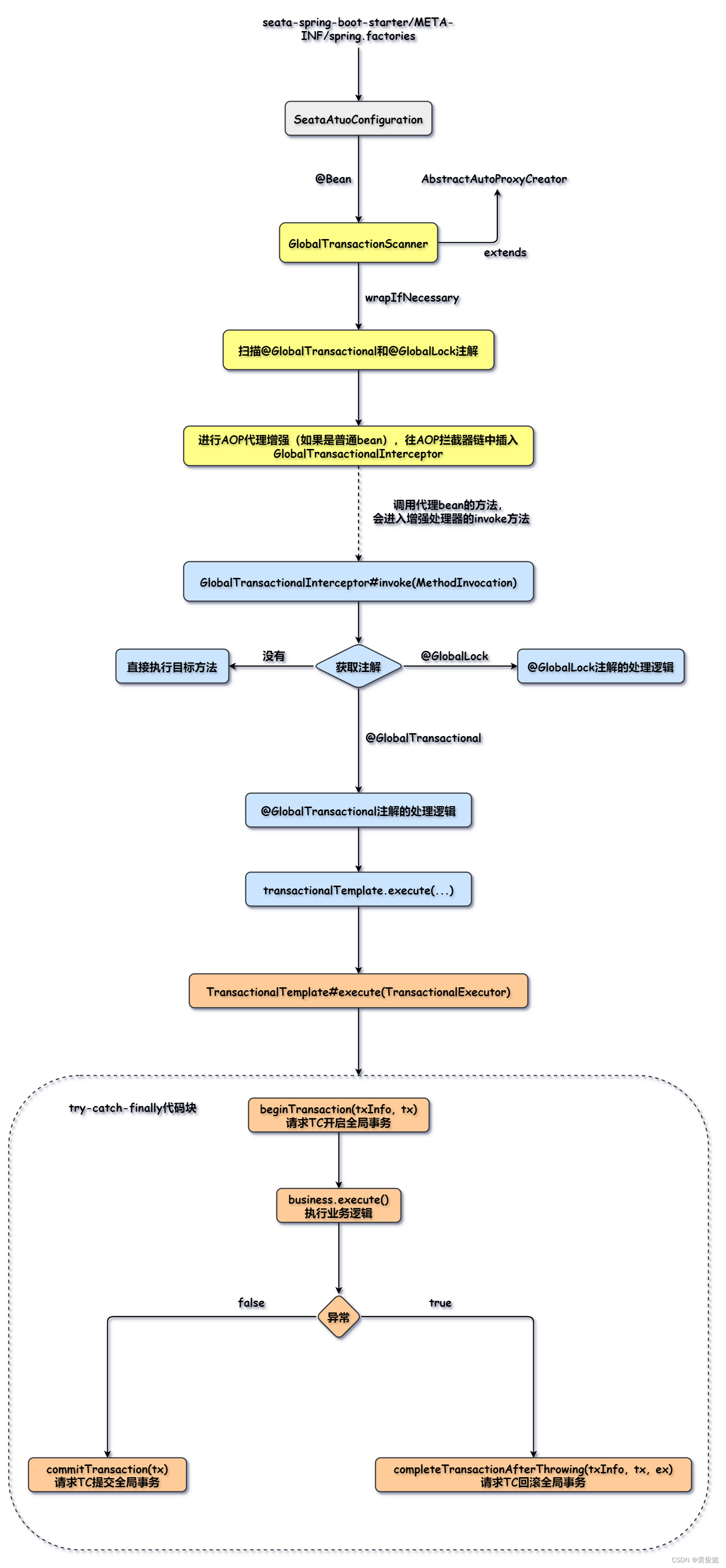 里面就会一个try-catch-finally代码块:全局事务开启,执行业务逻辑;如果调用链上发生异常,则在catch块中进行全局事务回滚;否则提交全局事务。