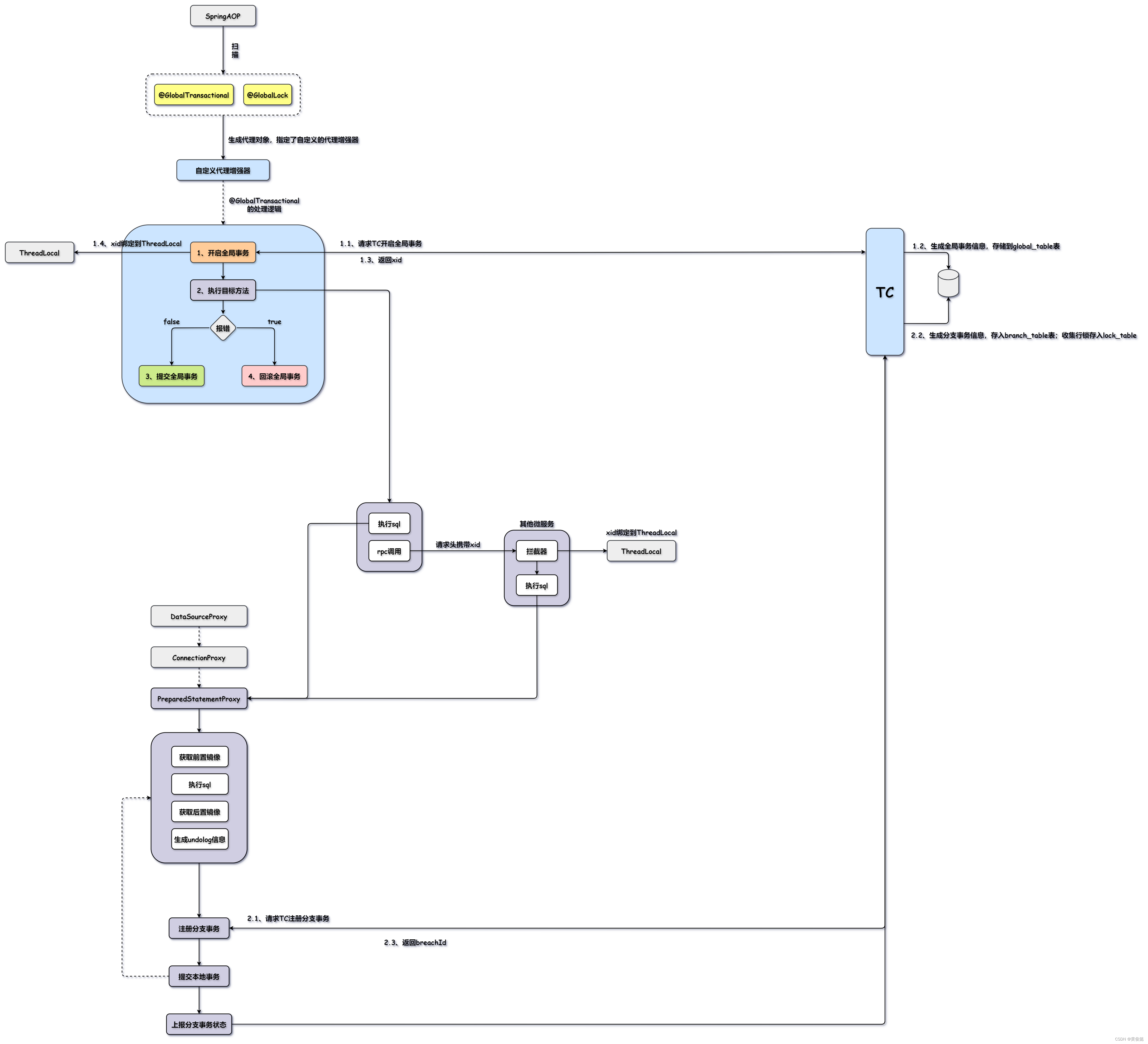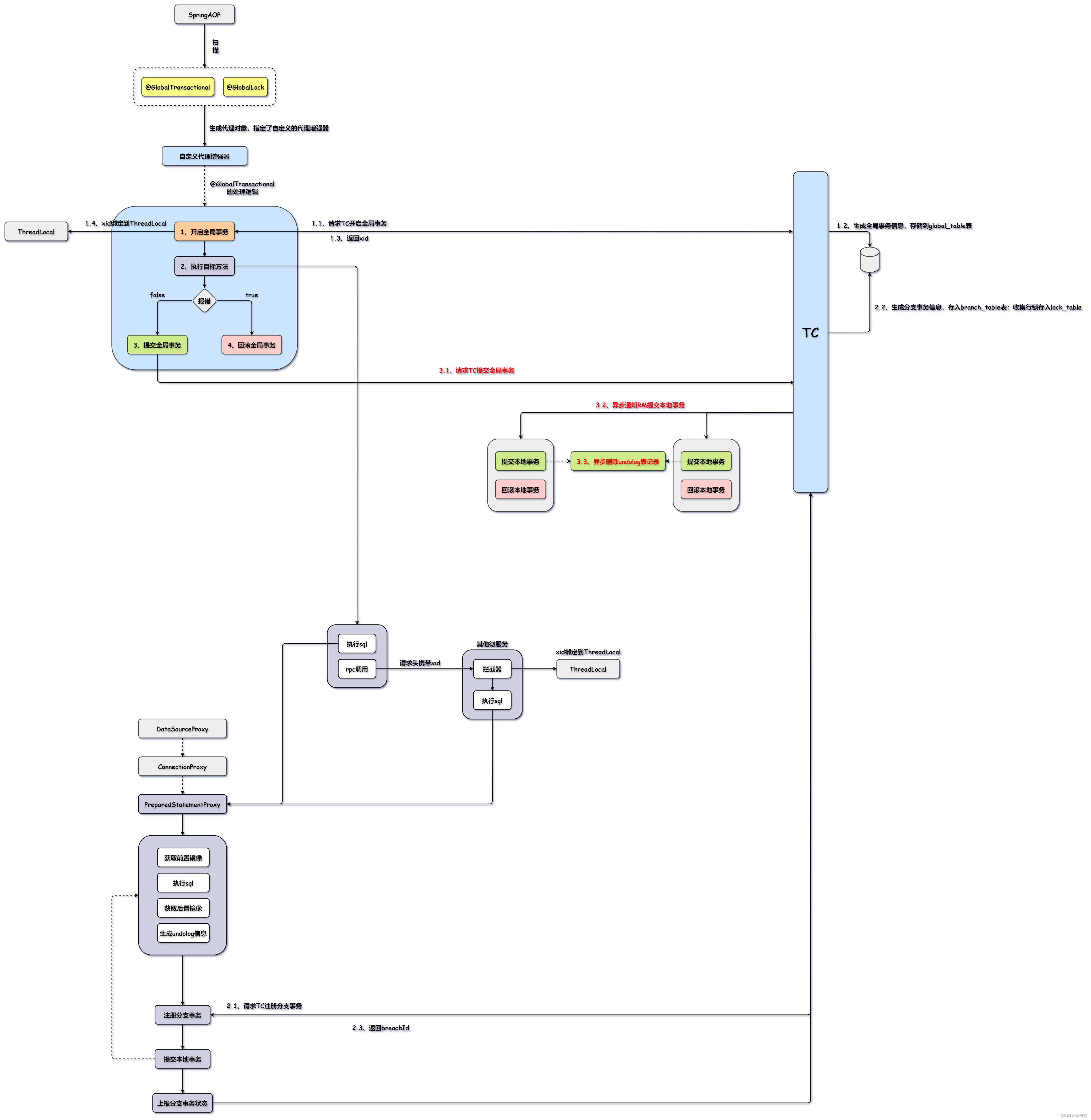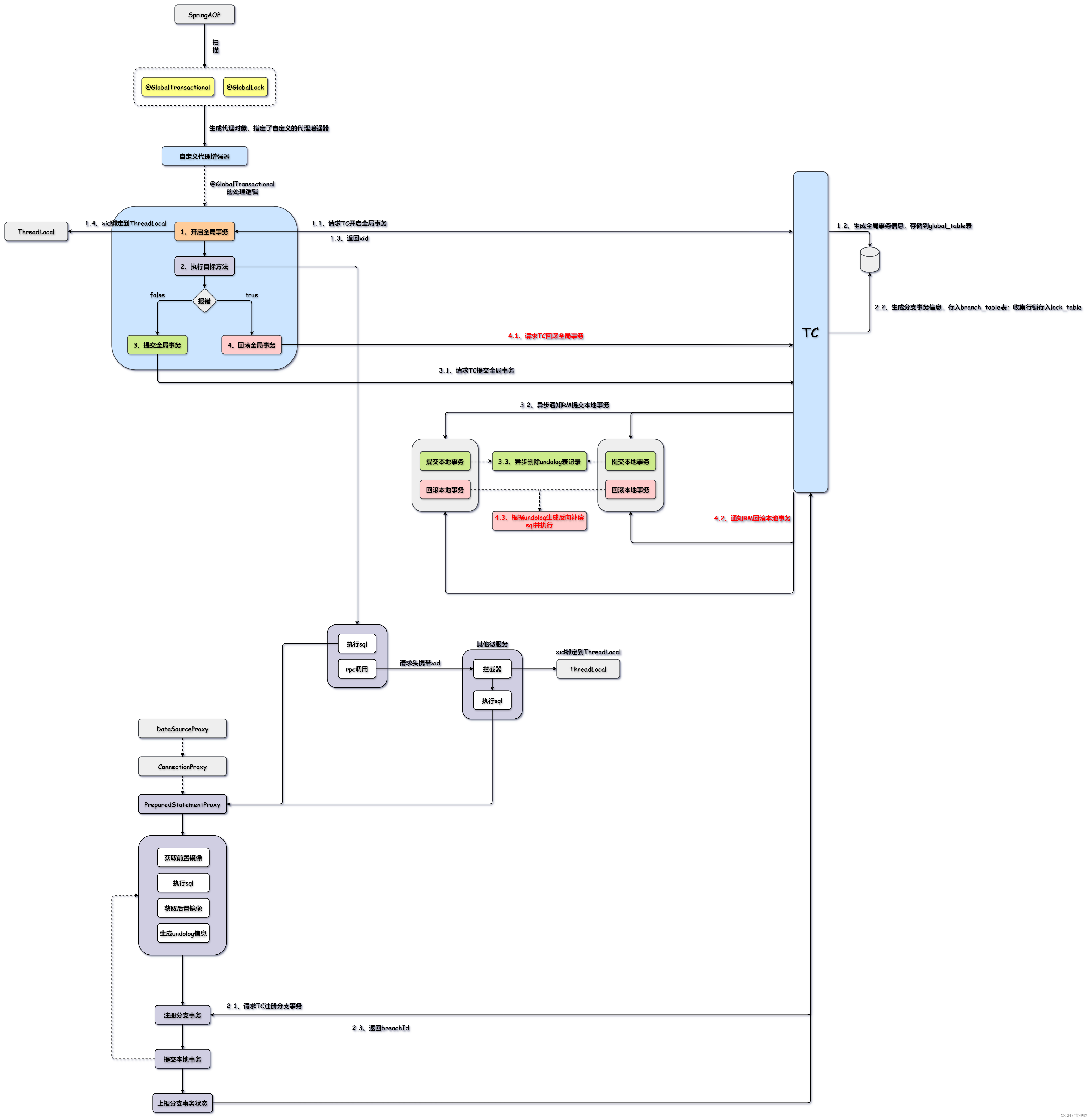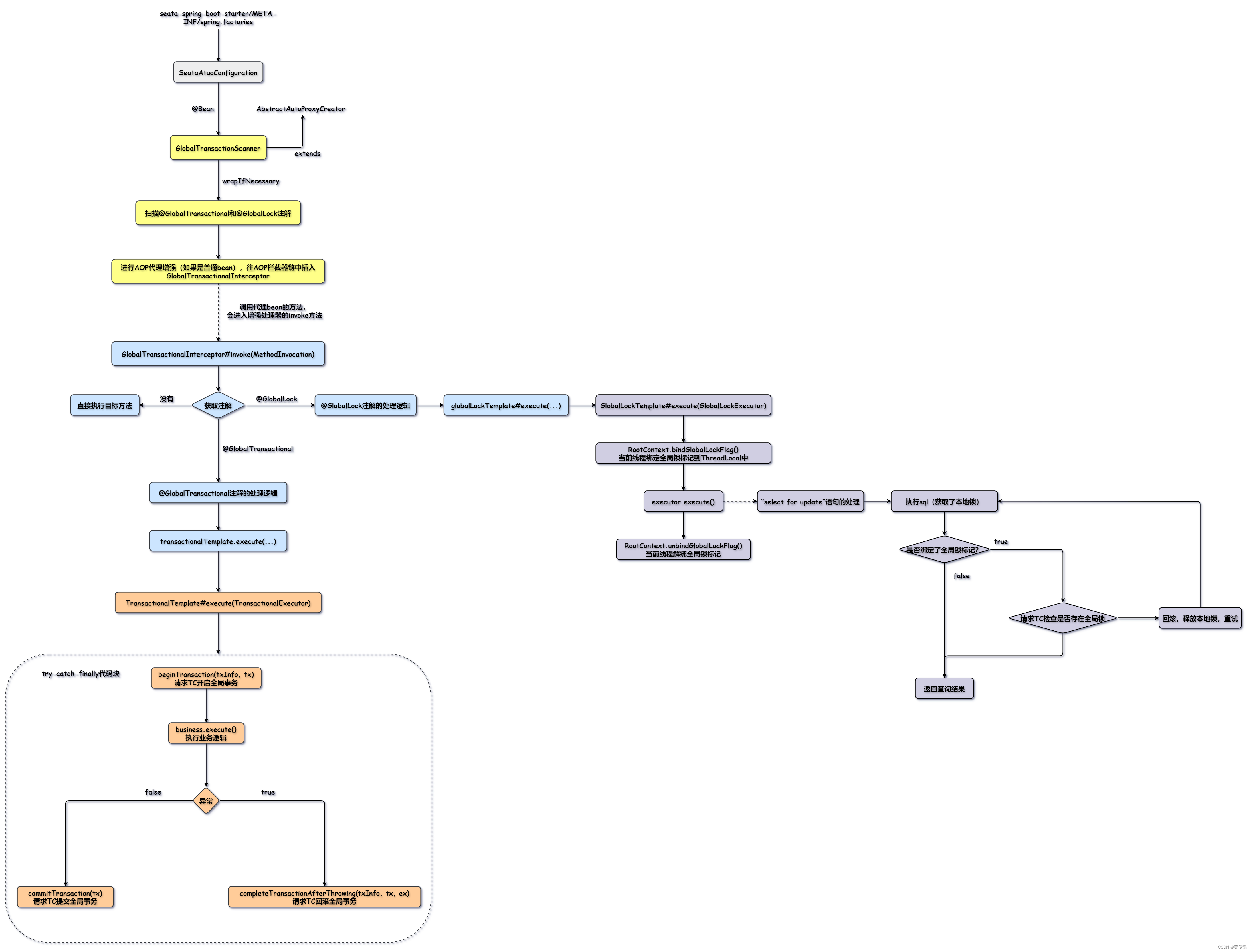 里面就会一个try-catch-finally代码块:全局事务开启,执行业务逻辑;如果调用链上发生异常,则在catch块中进行全局事务回滚;否则提交全局事务。