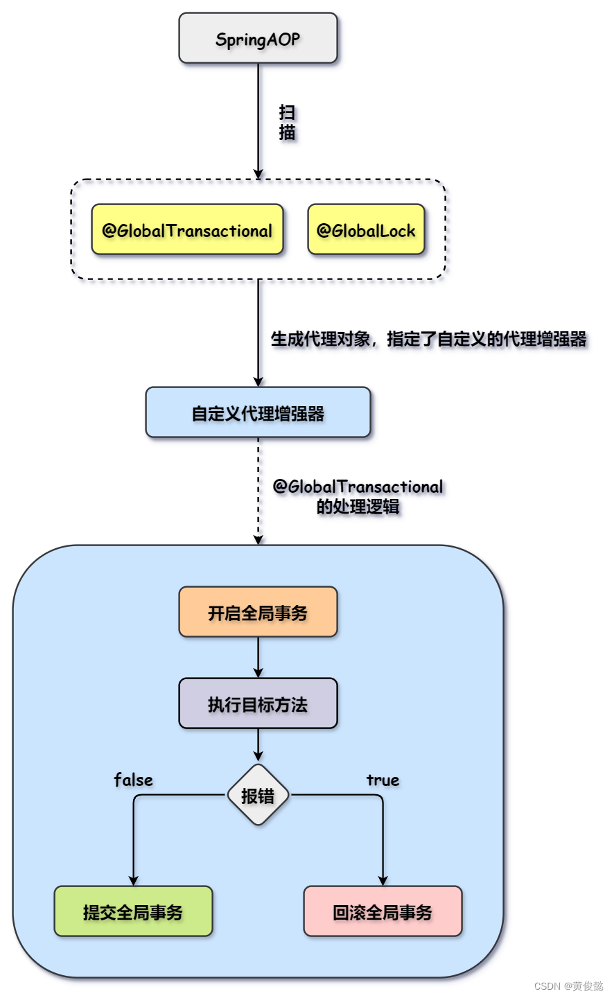 自定义的代理增强器的对于@GlobalTransactional注解的处理逻辑就是开启全局事务、执行目标方法,提交/回滚全局事务。