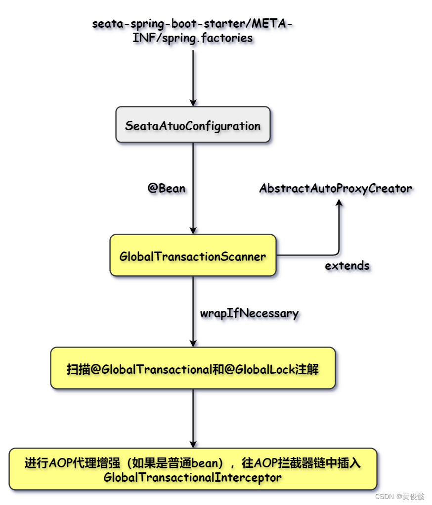 GlobalTransactionScanner继承了AbstractAutoProxyCreator,重写了wrapIfNecessary方法。wrapIfNecessary方法会扫描到当前bean的类上或方法上是否有@GlobalTransactional或@GlobalLock注解修饰,如果有@GlobalTransactional或@GlobalLock注解修饰,则会对当前bean做增强处理。如果当前bean已经是一个AOP代理bean,那么往AOP拦截器链中放入指定的拦截器GlobalTransactionalInterceptor;如果当前bean是一个普通bean,那么对其进行AOP代理增强,指定AOP拦截器为GlobalTransactionalInterceptor。