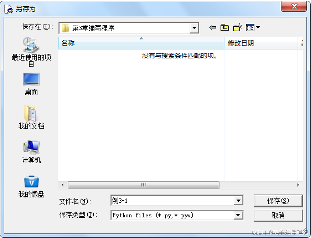 4、选择菜单File>Save将程序存盘,命名为例3-1.py